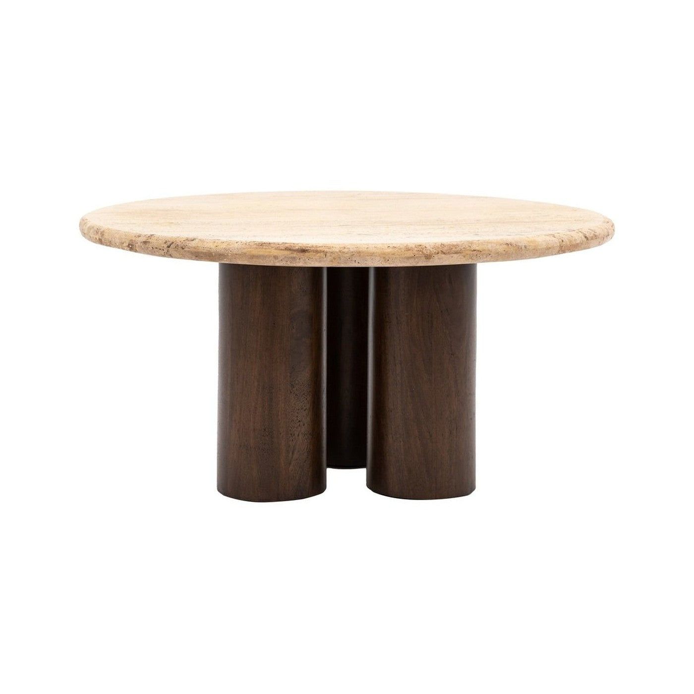 This stunning coffee table features chunky turned cylindrical legs, crafted from mango wood solids, paired with a solid travertine stone top which has a natural finish, to create a dramatic eye-catching look. Matching pieces are available.