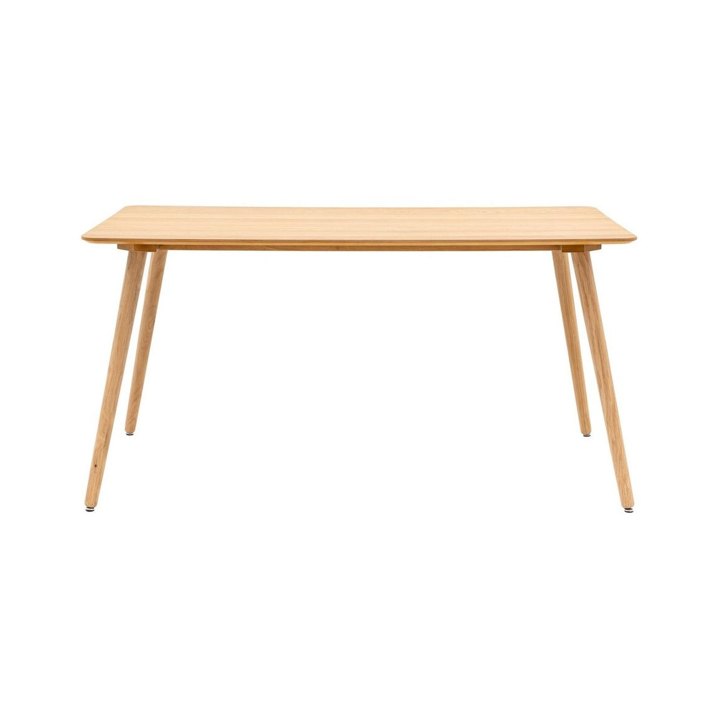 Offering retro style with a contemporary touch, this beautiful dining table features gently rounded corners which pair perfectly with the elegant legs. It is crafted from oak veneers and rubberwood with a natural finish. The table is also available in a smoked oak finish, and matching pieces are available.