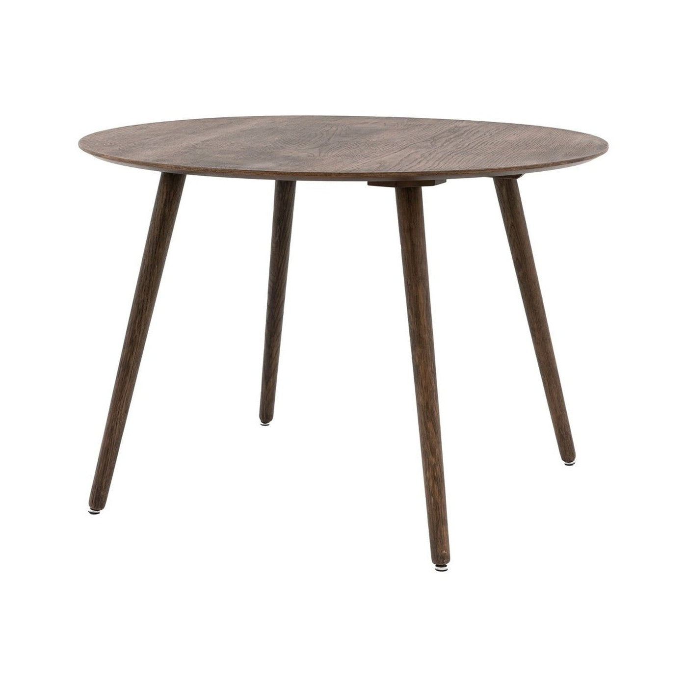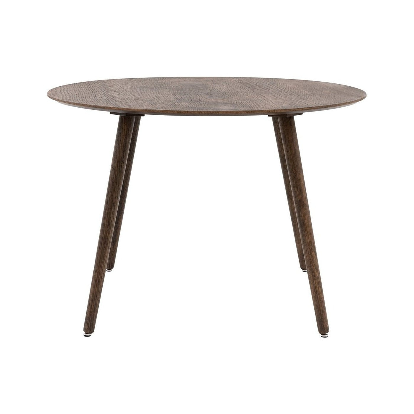 Offering retro style with a contemporary touch, this beautiful round dining table is crafted from oak veneers and rubberwood with a smoked oak finish. The table is also available in a natural finish, and matching pieces are available.