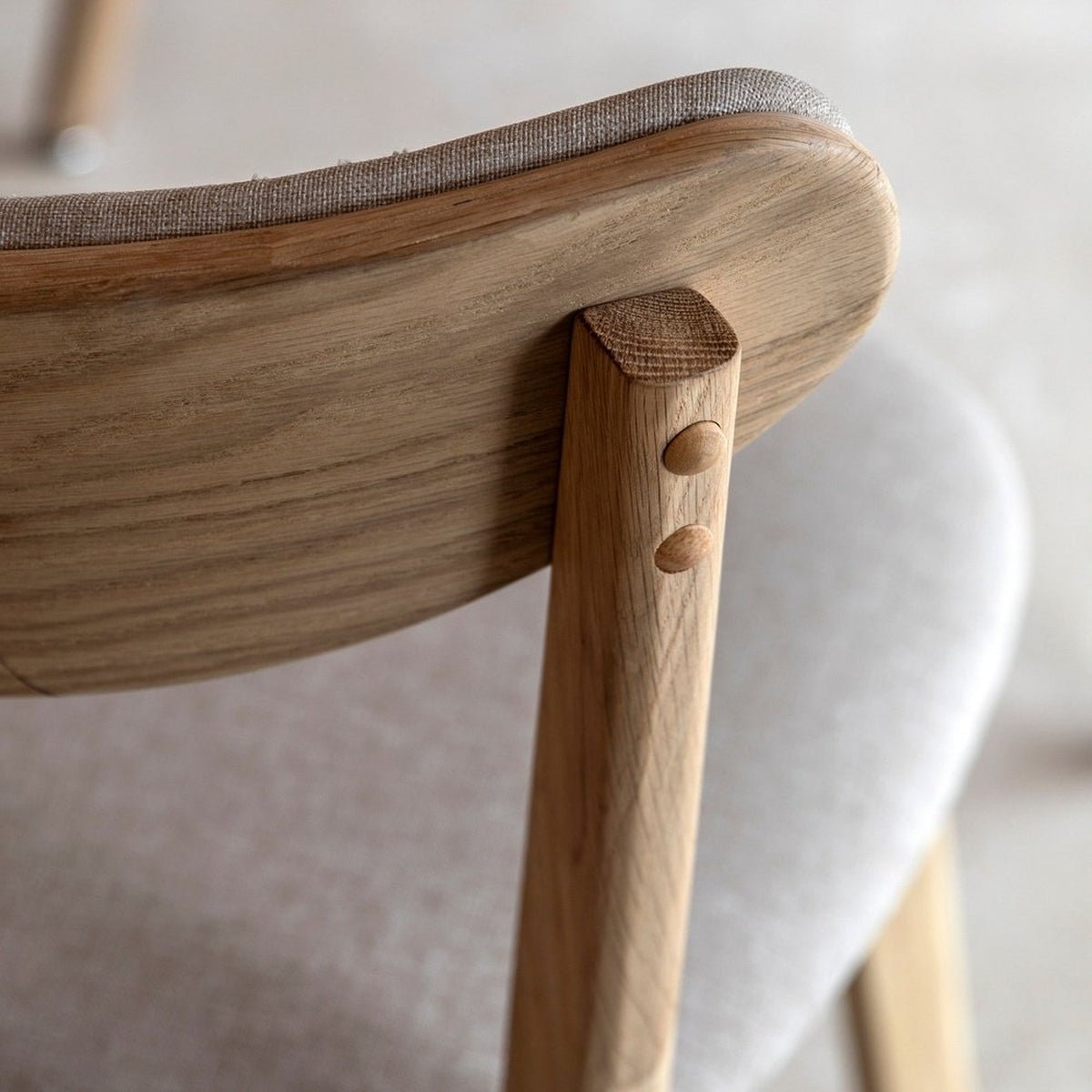 These lovely dining chairs, which comes in a pack of two, offer a retro feel with a contemporary touch. The frames are crafted from rubberwood with a natural oak veneer finish, the seats and gently curved back rails are upholstered in a lovely neutral fabric. The chairs are also available in a smoked oak finish. Matching pieces are available including four styles of dining table.