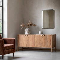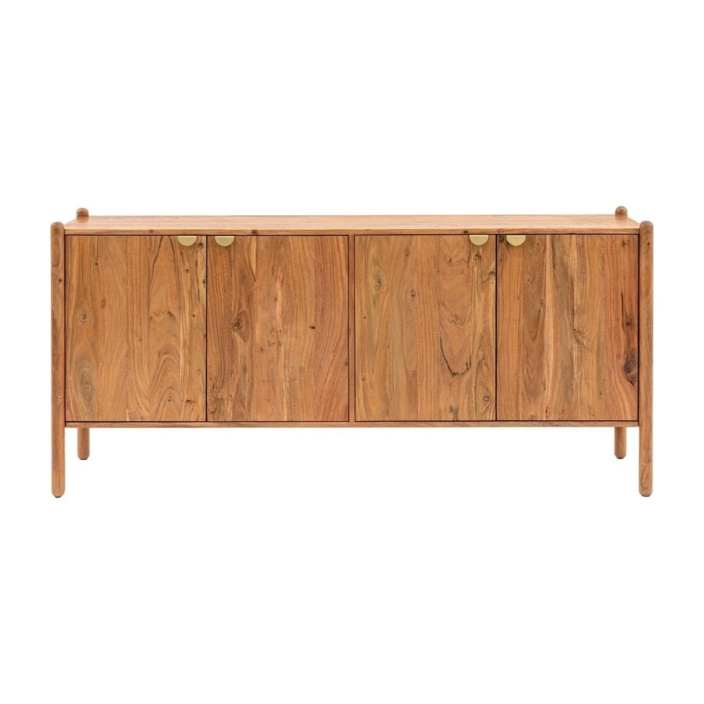 Crafted from rich Acacia wood this 4 door sideboard combines style and practical storage all in one. With a retro design influence and slim rounded legs, the sideboard is finished off with small half moon gold toned metal handles. Coordinating pieces also available.