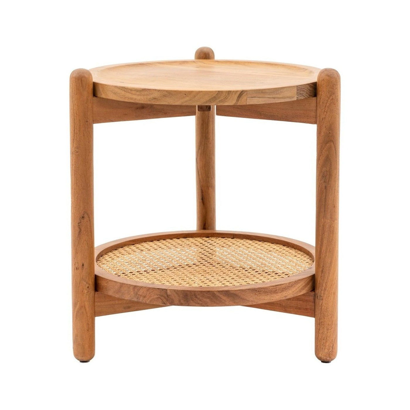 With retro and boho influences a modern twist has been added to this side table, making it the perfect addition to an eclectic design focused interior. Made using Acaci wood with a textured woven rattan lower shelf adding a little extra storage. Coordinating additional pieces also available.