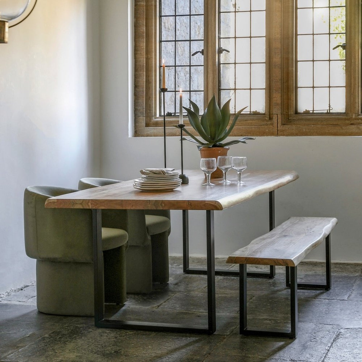This lovely dining bench features a solid acacia top with a live edge, paired with a black metal ‘U’ shaped underframe which gives a modern semi-industrial look, ideal for any eclectic interior. It looks perfect paired with one of the matching dining tables.
