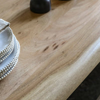 This lovely dining table features a solid acacia top with a live edge, paired with a black metal ‘U’ shaped underframe which gives a modern semi-industrial look, ideal for any eclectic interior. It looks perfect paired with the matching dining bench. A smaller table is also available.