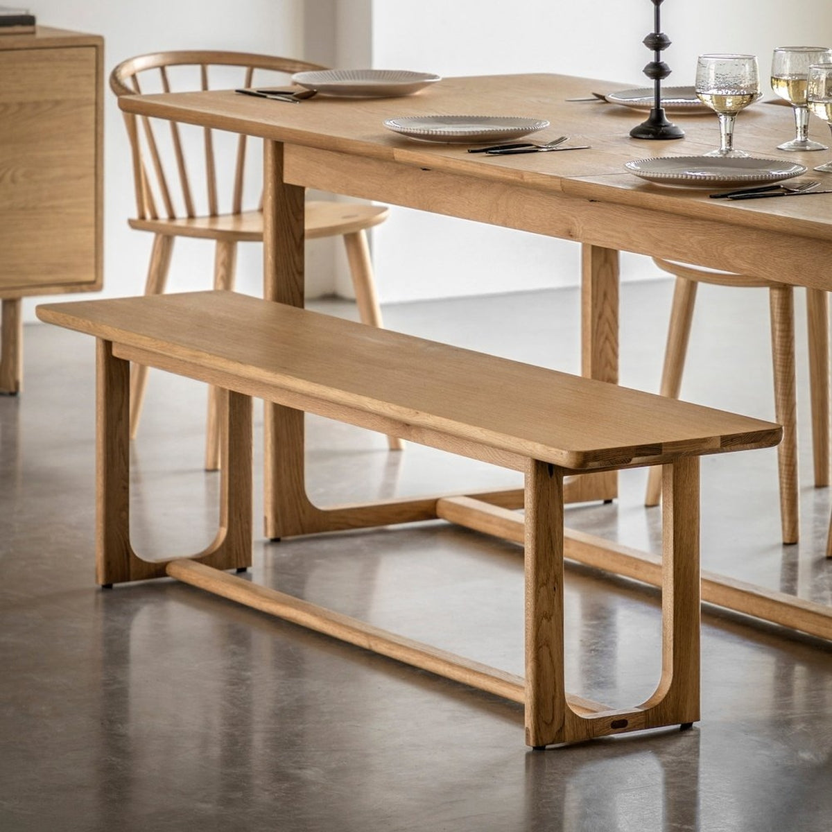 Crafted from the finest oak and structural oak veneers where practical, this stunning dining bench pairs perfectly with the matching dining tables. The bench offers elegant design, with its simple top and beautifully shaped underframe. The wood has a lovely natural finish. The bench is also available in a smoked oak finish, and matching pieces are available.