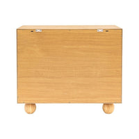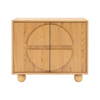 With a stand out geometric design and rounded feet, this 2 door cabinet combines a hint of retro design and with modern practicality. The oak and oak veneer cupboard will add a touch of on trend cool to your home, wherever you use it. Coordinating pieces also available.