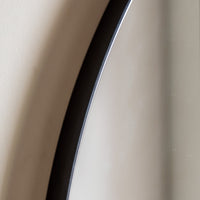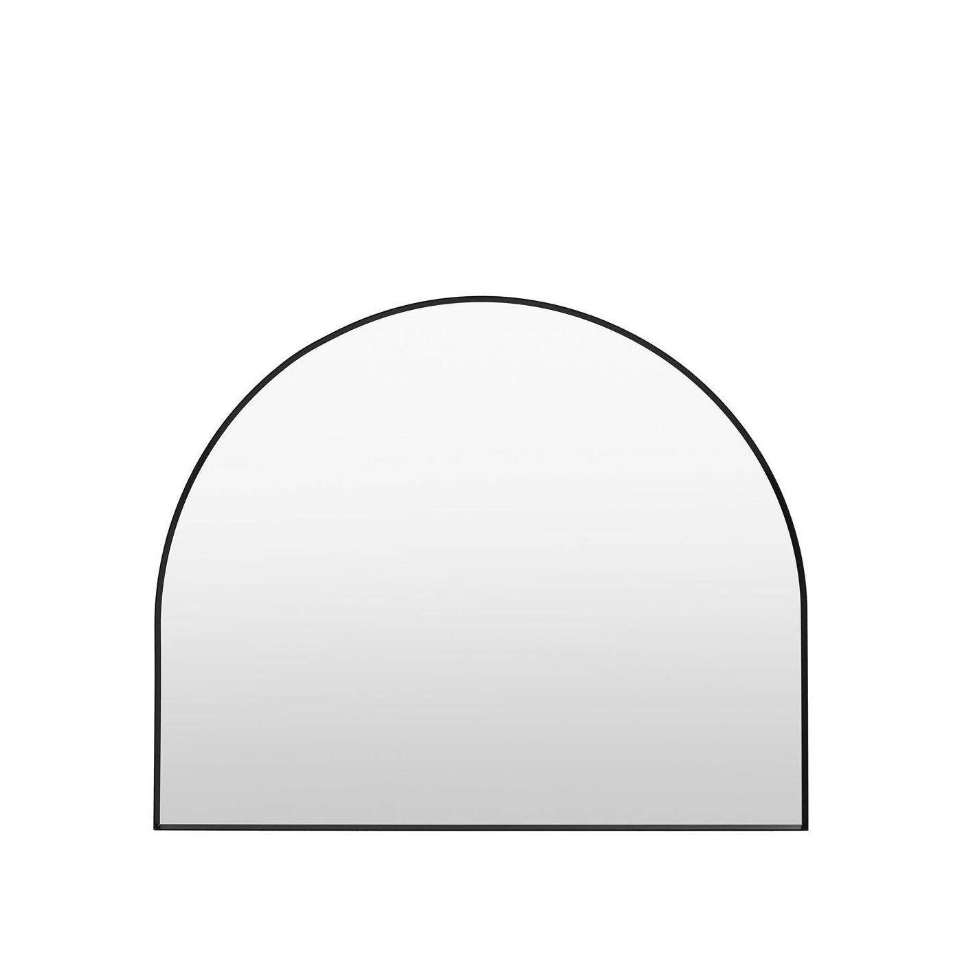 A semi-circle mirror with a thin black frame over a mantel is a sleek and stylish decor choice, perfect for adding a modern yet minimalist touch to a living space. This type of mirror would be perfect for a living room, particularly in homes with minimalist, Scandinavian, or industrial design themes.