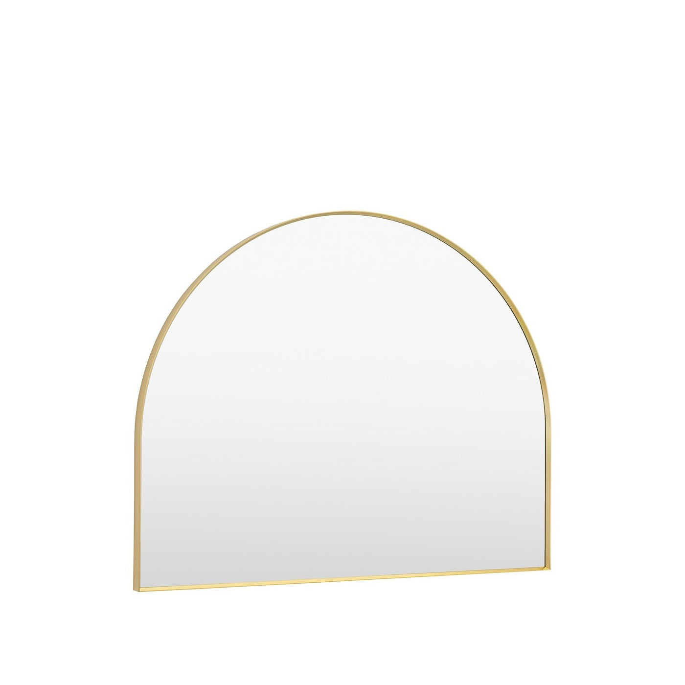 A semi-circle mirror with a thin gold frame over a mantel is a sleek and stylish decor choice, perfect for adding a modern yet minimalist touch to a living space. This type of mirror would be perfect for a living room, particularly in homes with minimalist, Scandinavian, or industrial design themes.