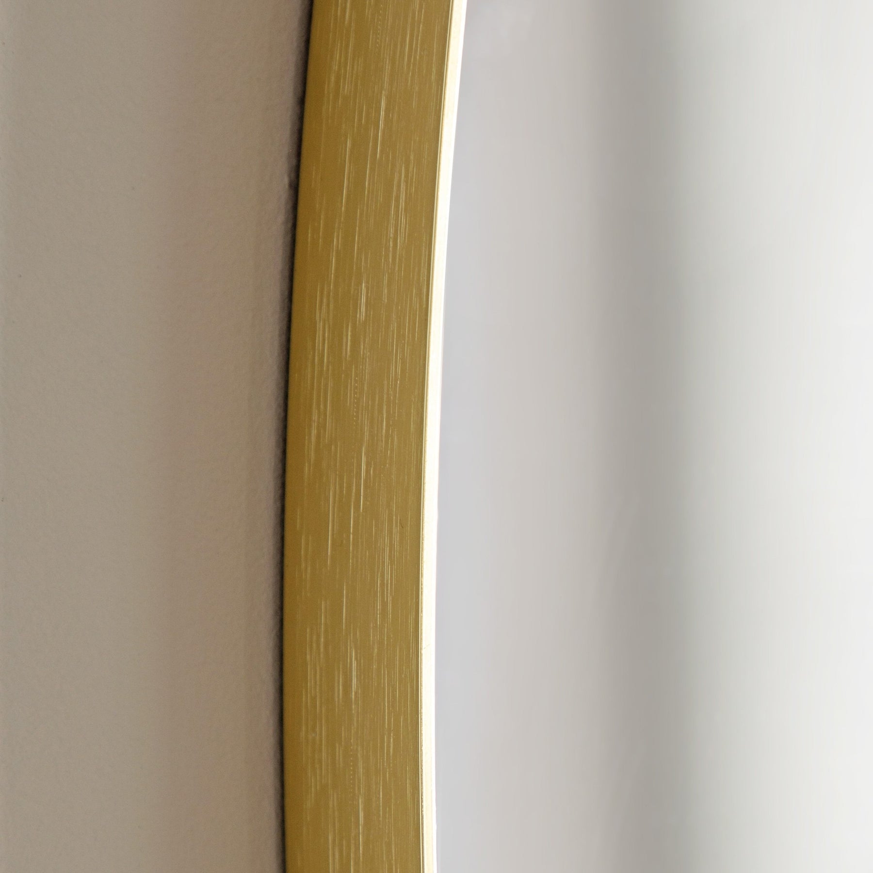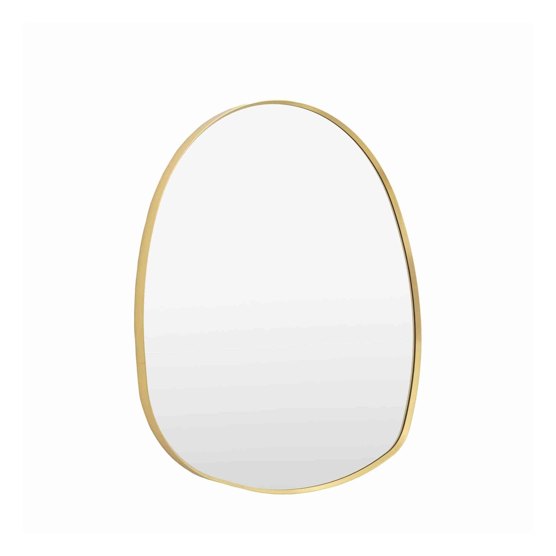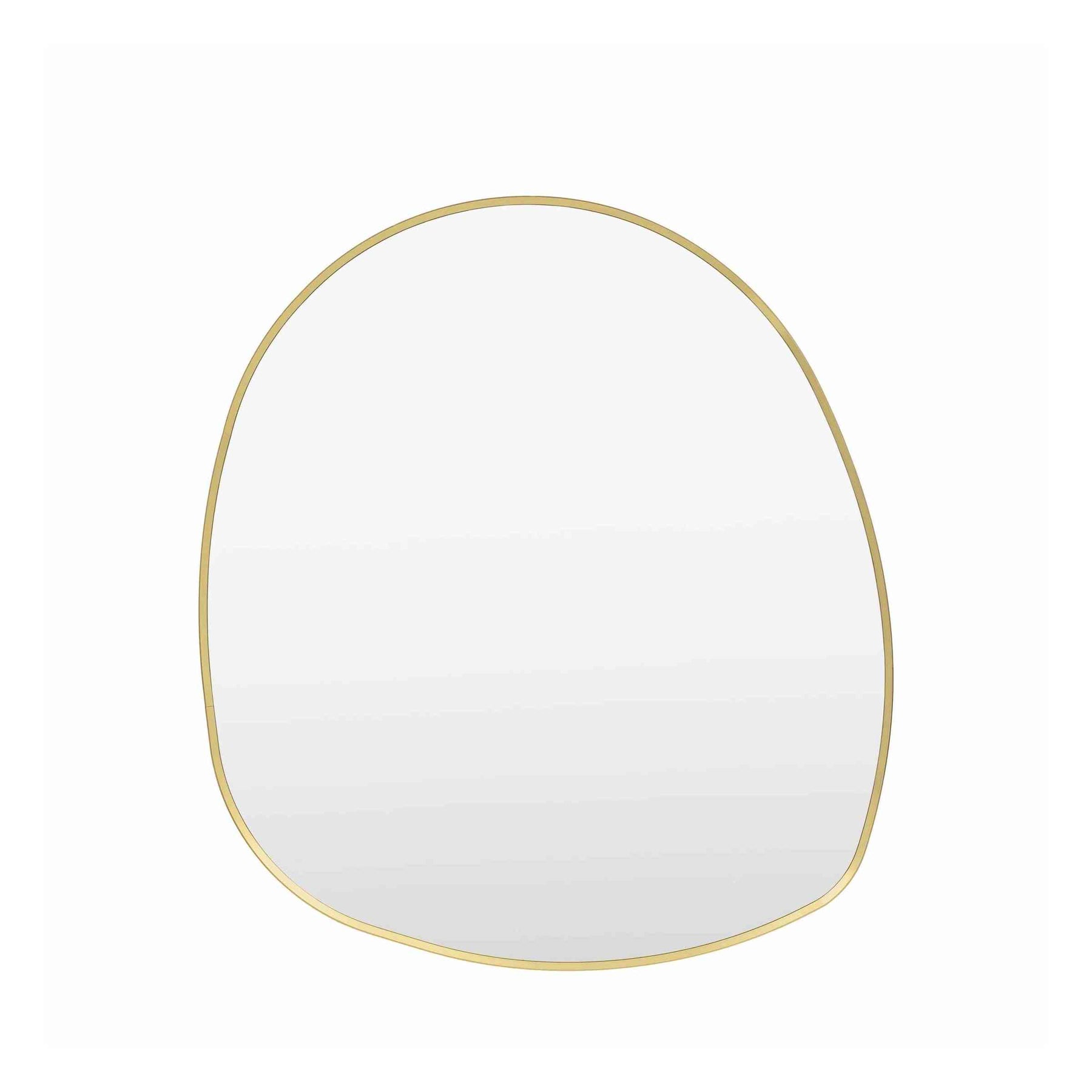 An organic pebble-shaped mirror with a thin gold frame is a striking and contemporary design element. Its natural, irregular form adds an organic softness, while the gold frame provides a sleek, modern edge.