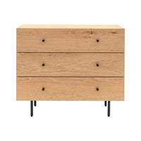 Offering a lovely contemporary look, this practical chest of drawers is crafted using oak veneers paired with a black metal underframe and drawer handles. The natural wood veneer, with its unique random knots, has been selected to give a modern rustic style. Matching pieces available.