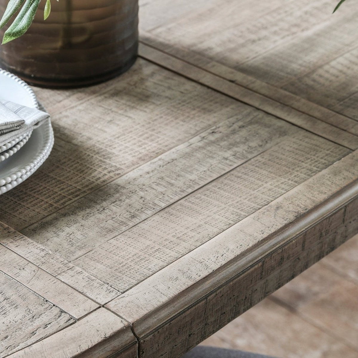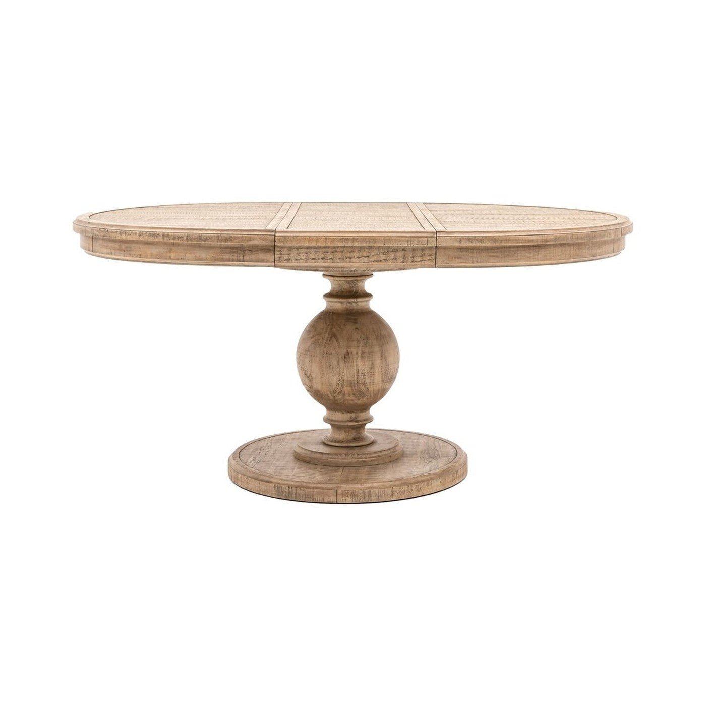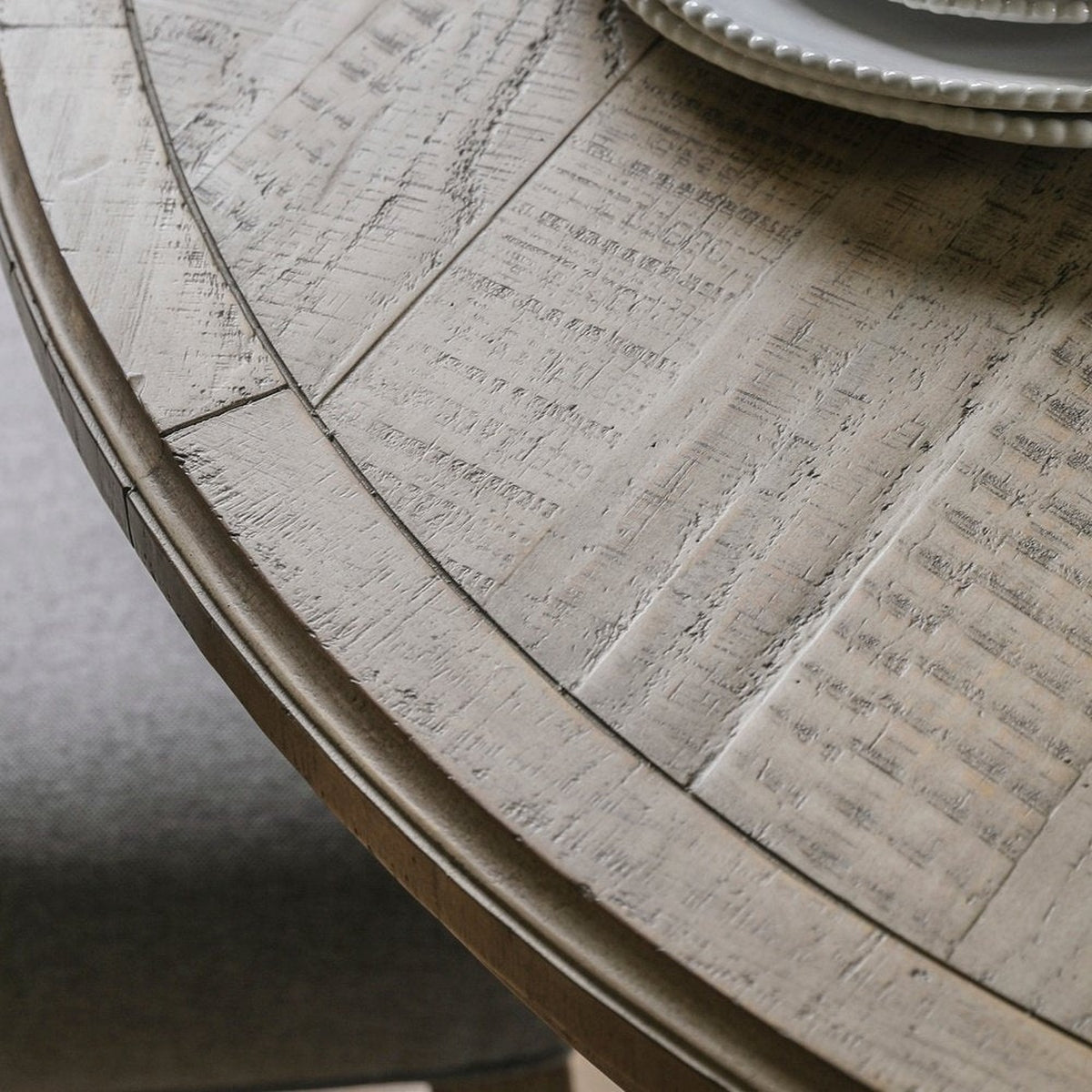 This lovely round dining table is extendable to seat extra guests for added practicality. It is crafted from North American pine solids and veneers where practical, with the clever use of a mill saw giving characteristic features of cross sawn timber to create a tactile, dramatic finish. Matching pieces are available.