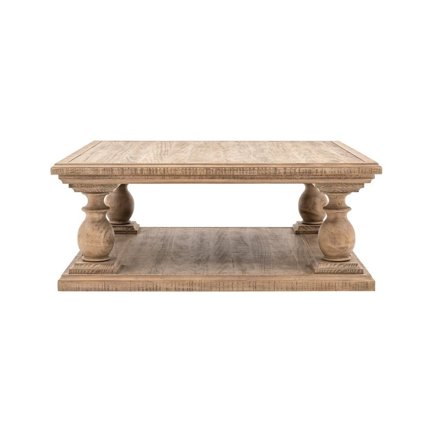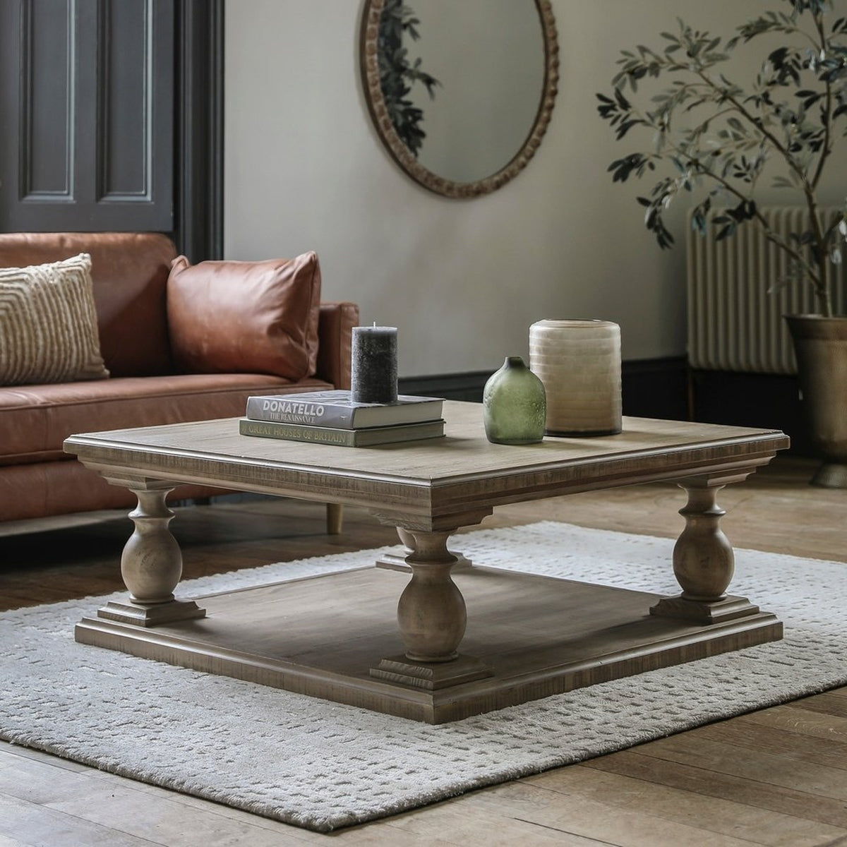 Featuring the clever use of a mill saw which gives characteristic features of cross sawn timber to create a tactile, dramatic finish, this beautiful coffee table offers a sophisticated yet rustic look. It is crafted from North American pine solids and veneers where practical, and features a solid shelf base for added practicality. Matching pieces are available.