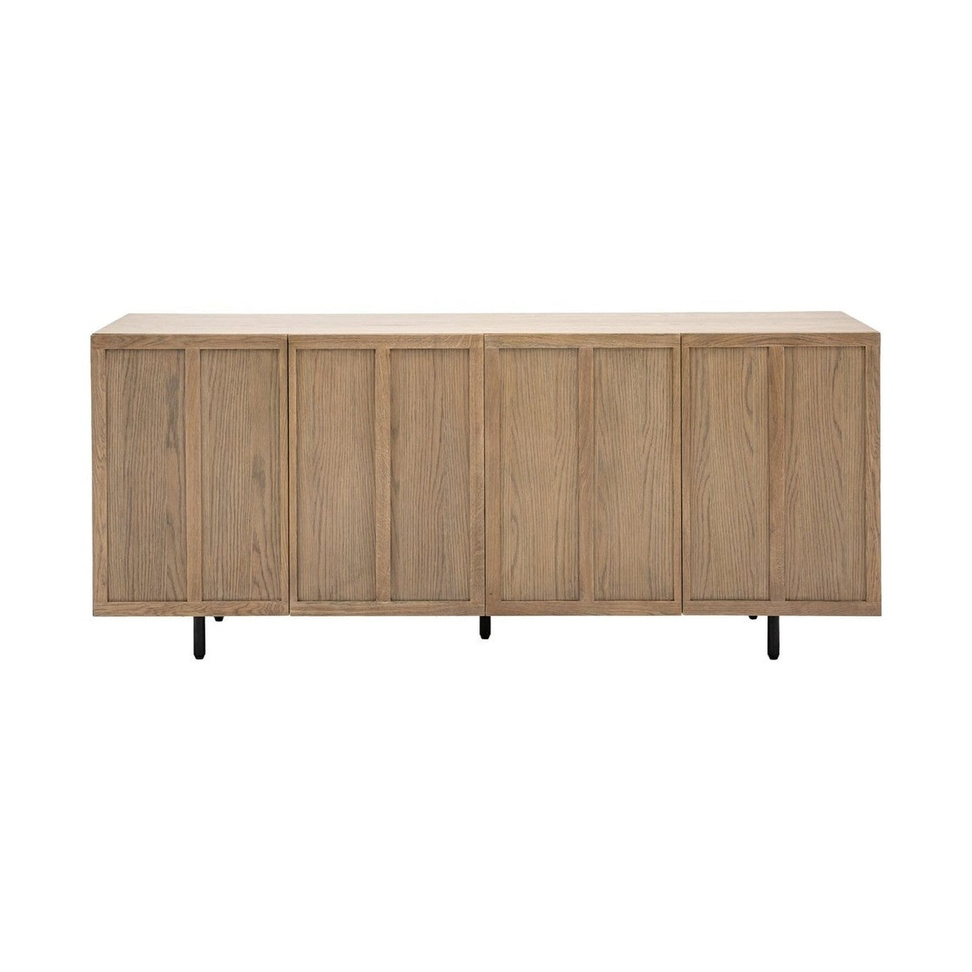 Easy to live with, this lovely sideboard offers practical storage combined with stylish design. Perfect for modern apartment living, it would look equally at home in a wide range of interiors. It has retro style panelled fascias in oak veneers and solids with a weathered grey finish, paired with black metal legs. Matching pieces are available.