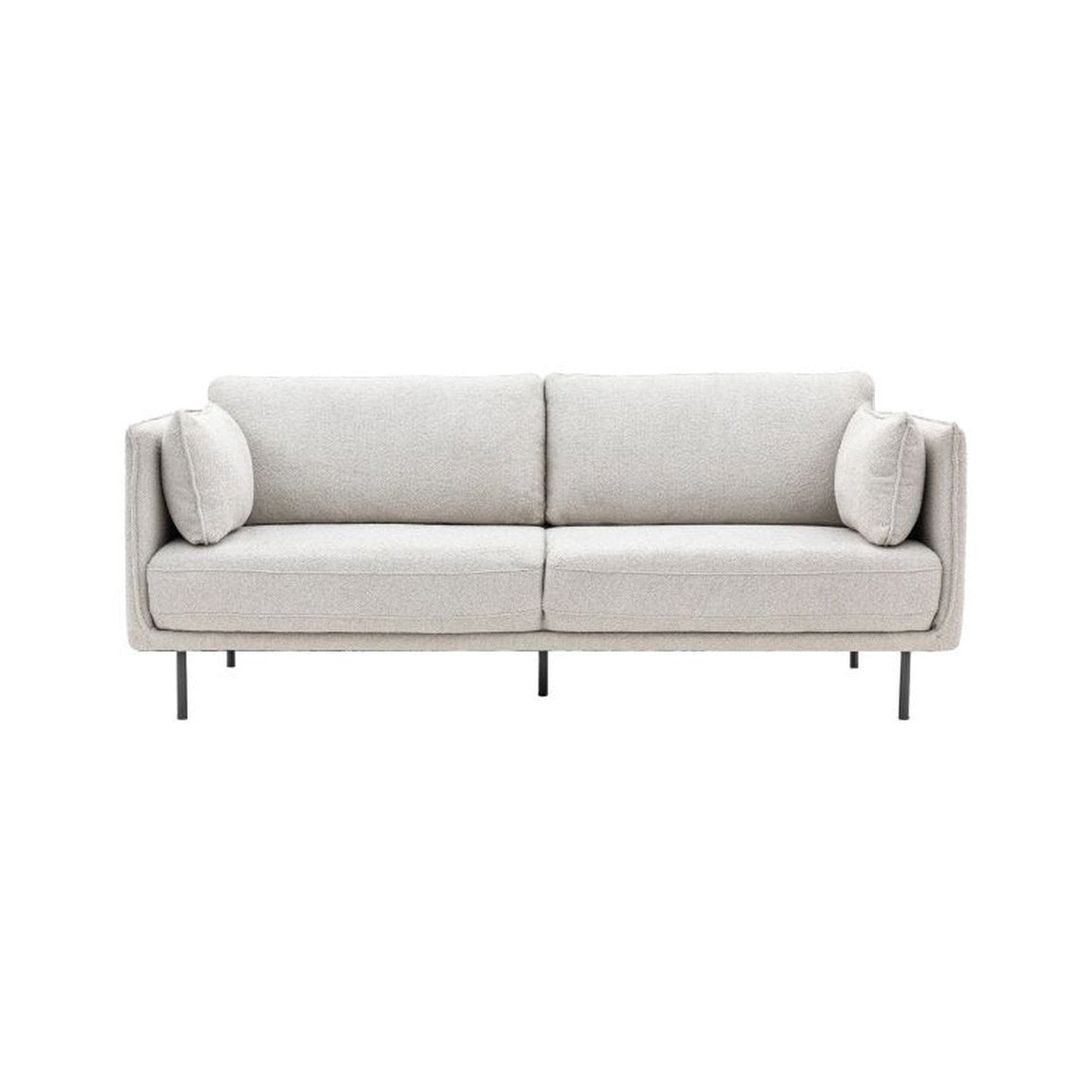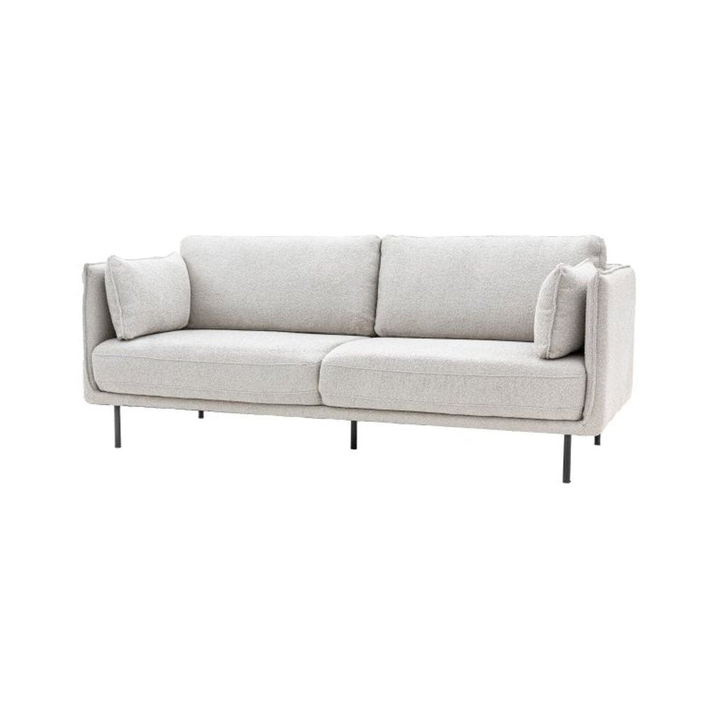 Offering a sleek contemporary look, this stylish sofa is fully upholstered in a lovely natural coloured boucle, with black metal legs perfectly complementing the design. The slim arms feature stitch seam detailing which is echoed on the side cushions. Also available in other colours.