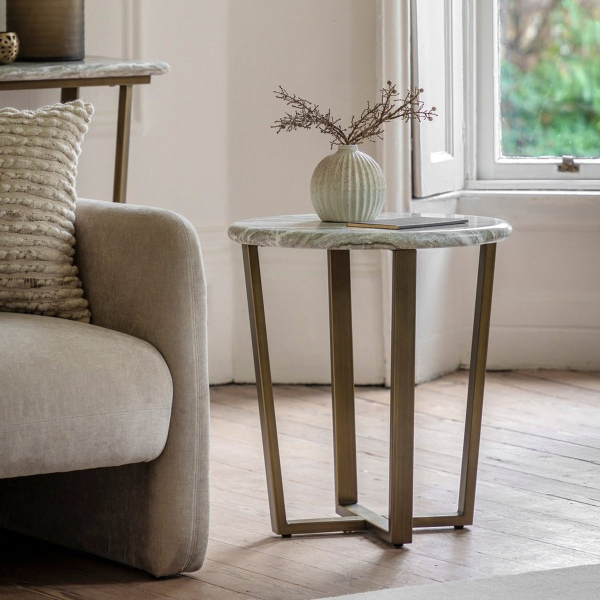 This lovely side table will add a touch of sophisticated elegance to a room. The stunning top features the most amazing green-grey marble faux finish which is created with the latest state of the art technology to give the look and feel of the real thing but without the weight and technical difficulties. The faux marble is perfectly complemented by the metal base which has a classy bronzed brass finish, to give an understated luxury style, perfect for any classic modern interior. Matching items also available.
