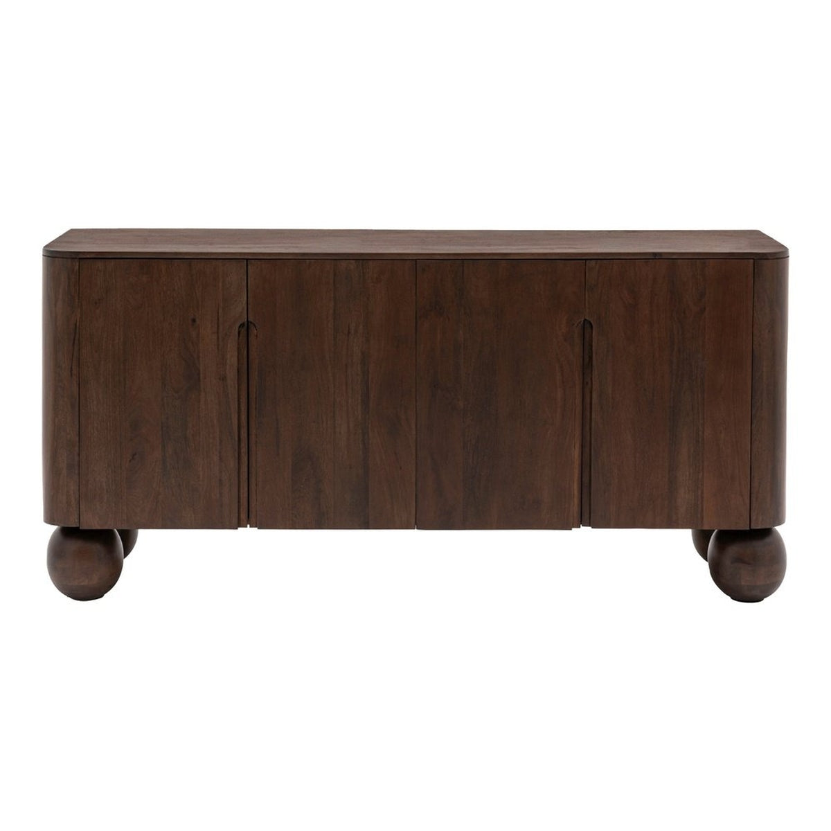 This eye-catching sideboard is crafted using mango wood solids with a rich deep finish. The front corners of the sideboard are gently curved with the elegant slim cut-out handles on the doors curving at the top to echo this. Turned ball feet complete the look to create this dramatic retro piece. Coordinating items are available.