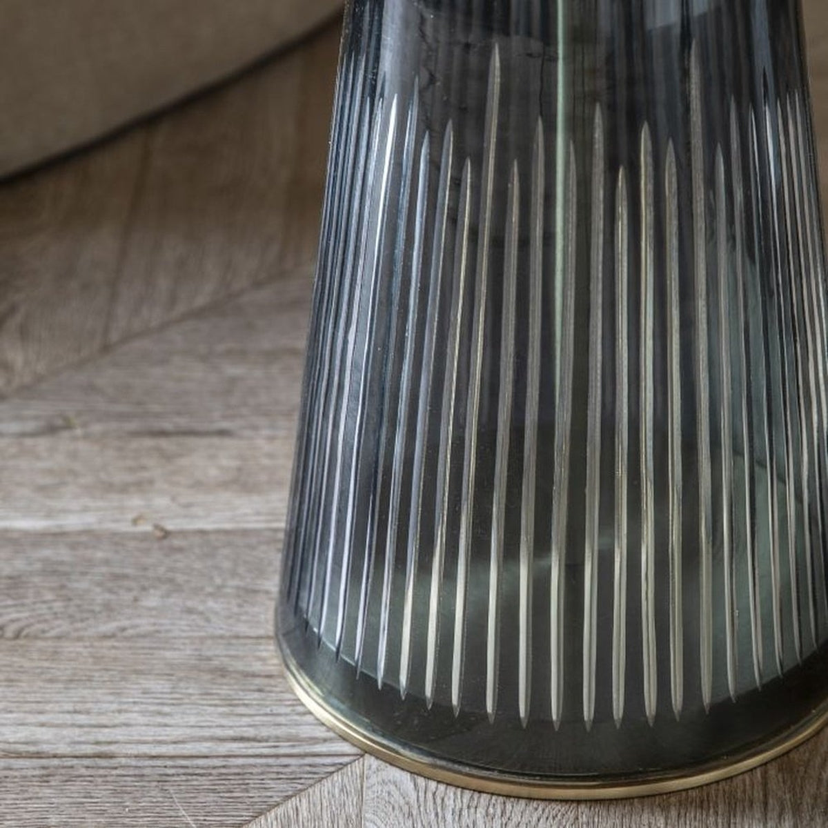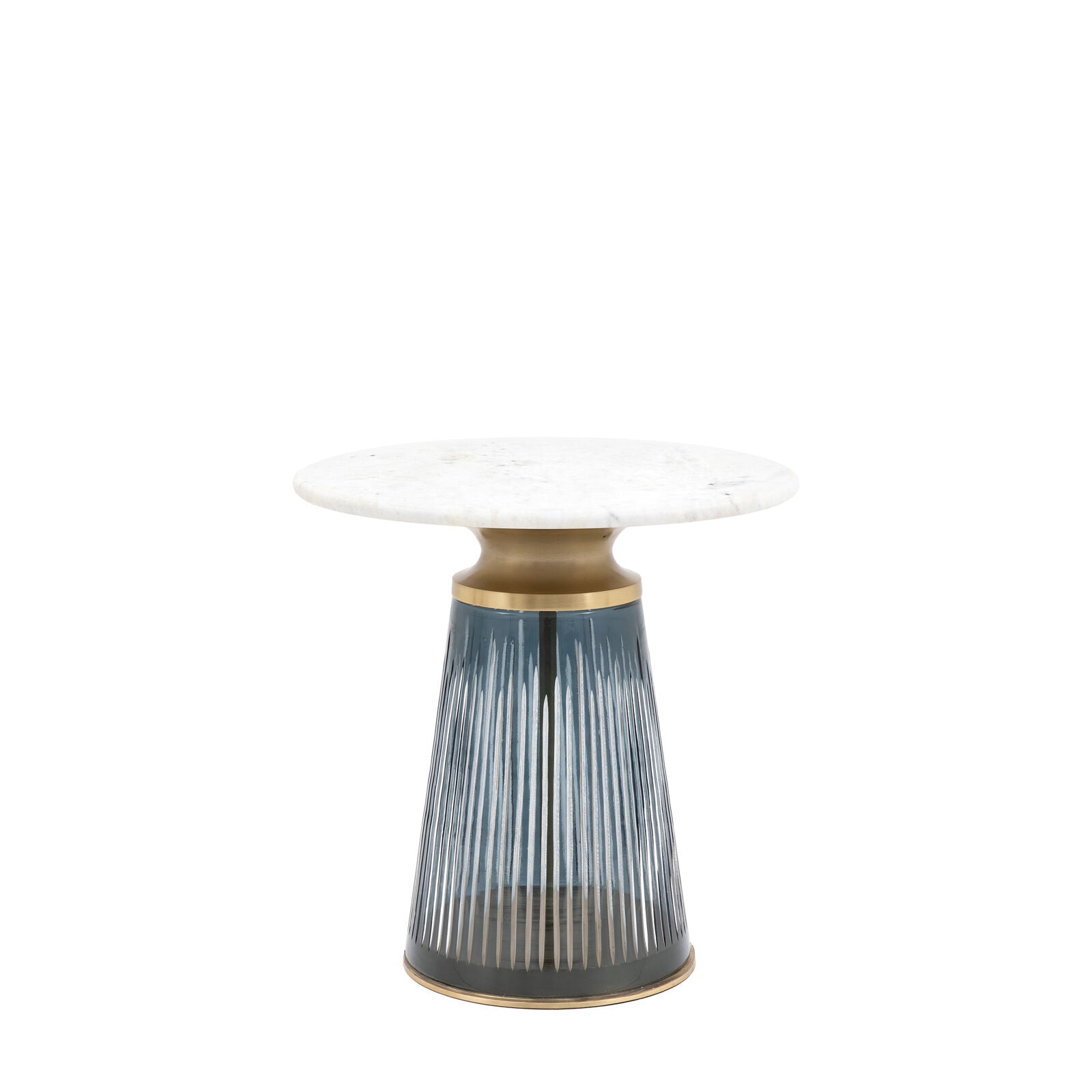 Add some luxe to your room with this unique side table. The incredibly stunning blue glass base features a unique design of liner striations which is not to be outdone by the metal collars and the ultimate in luxury, a white marble table top. Also available in a dusk toned glass base.
