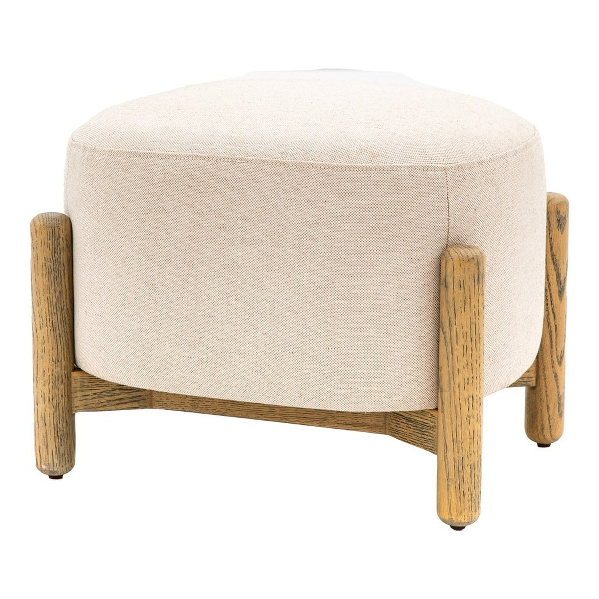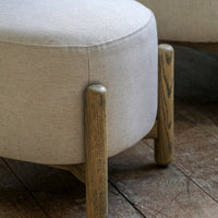 The eye-catching style of this lovely footstool features a beautifully designed wooden base which supports a deep cushion, upholstered in a lovely natural coloured fabric. It is also available in an vintage-style brown leather and matching armchairs are available.
