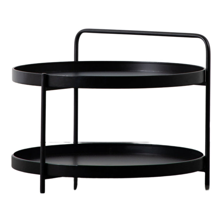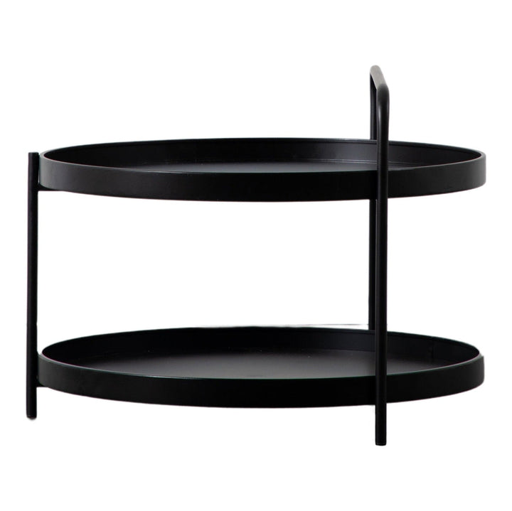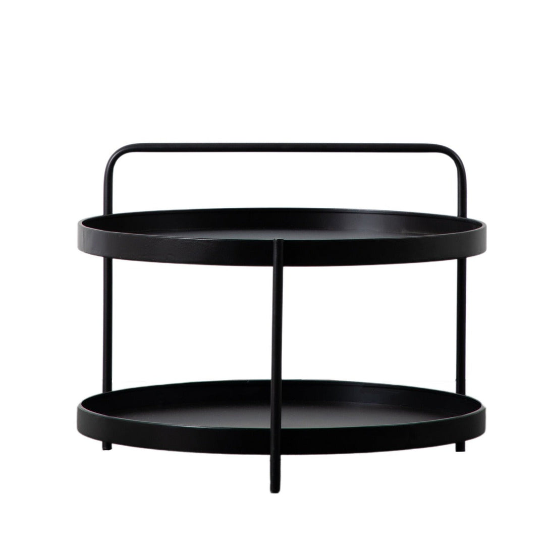 Contemporary coffee table crafted from metal with a black finish, with a tray-style top and lower shelf. The stunning design features a continuation of one section of the base, up and over the table to create a ‘handle’ effect. A matching side table is available and both are also offered in a gold leaf finish.