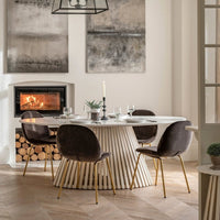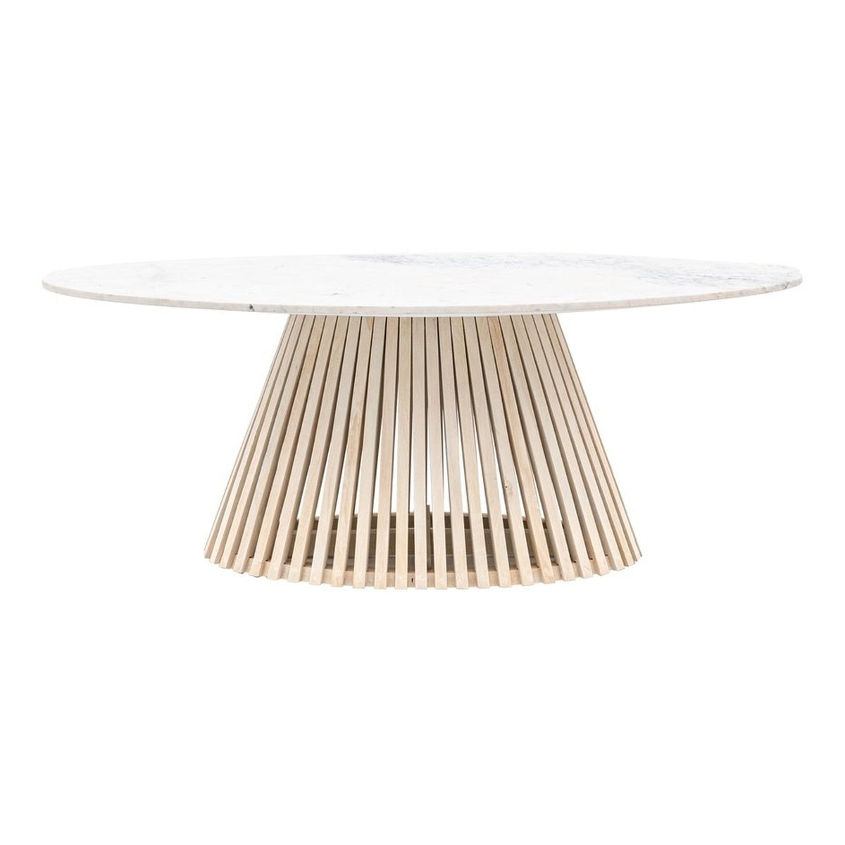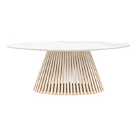 Offering stylish contemporary design, this beautiful oval dining table has a stunning white Indian marble top which is paired with a stunning base to create an elegant, classy table. The base is crafted from gently sloping slats of mango solid timbers with a white-washed, sand-blasted finish, creating a striking design feature. Matching items are available.