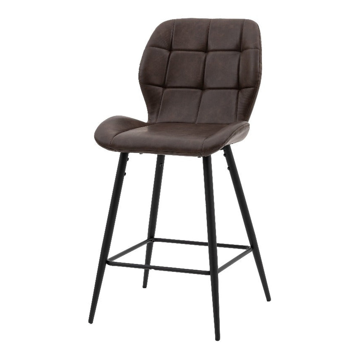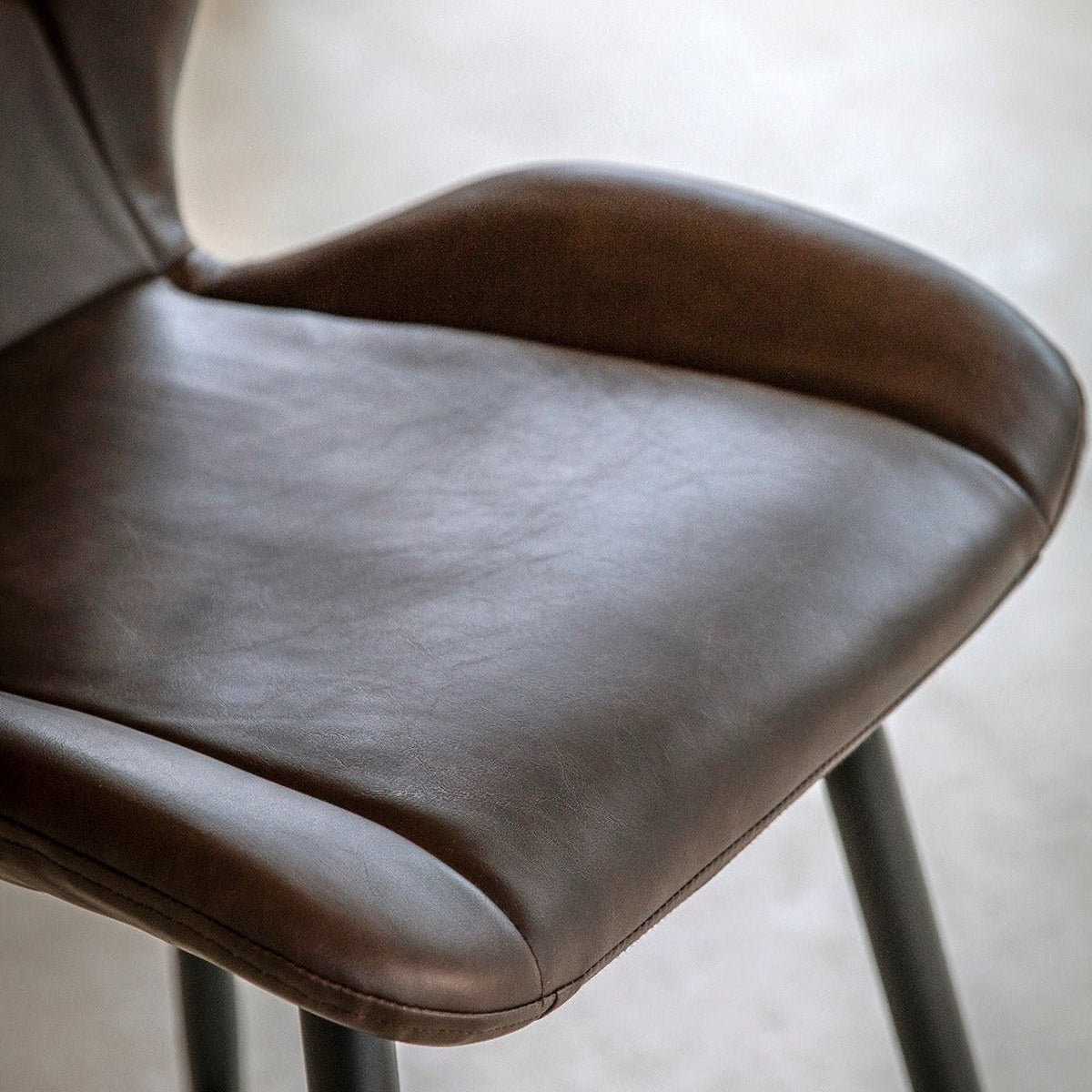 These mid-century inspired modern stools will make a stand out addition to your room. The shaped back and curved seat are upholstered in brown faux leather with extra stitch detailing, paired with metal legs, for a contemporary look. Also available in other colours, and matching chairs available.