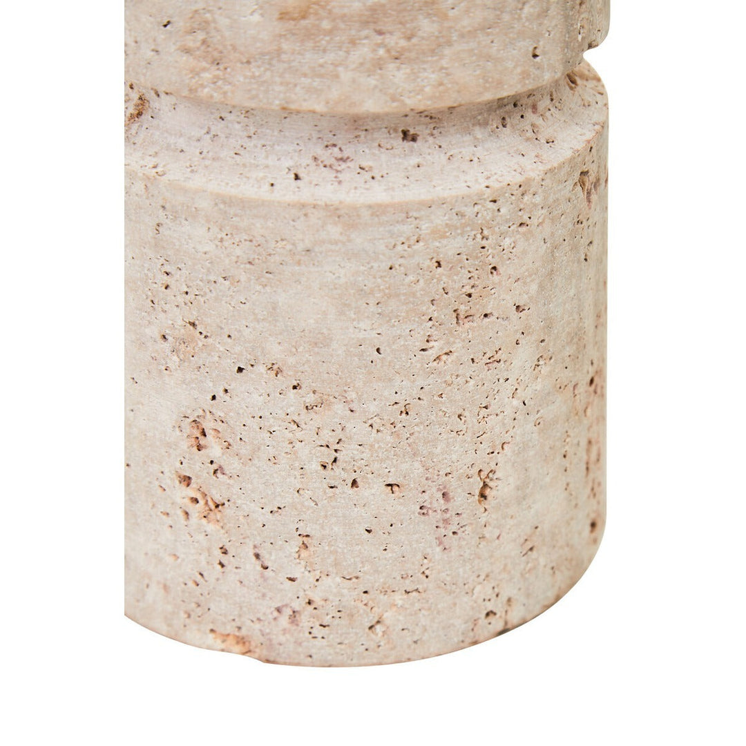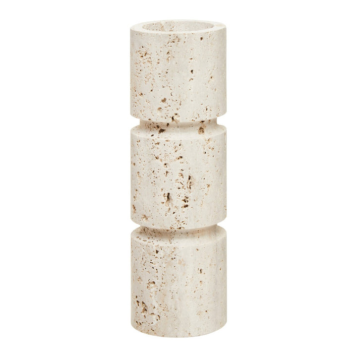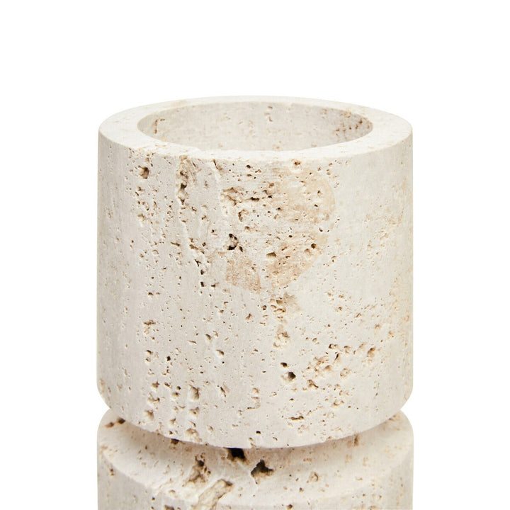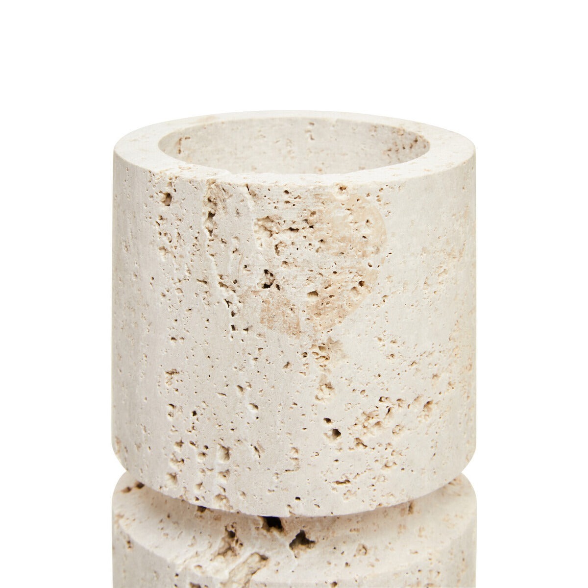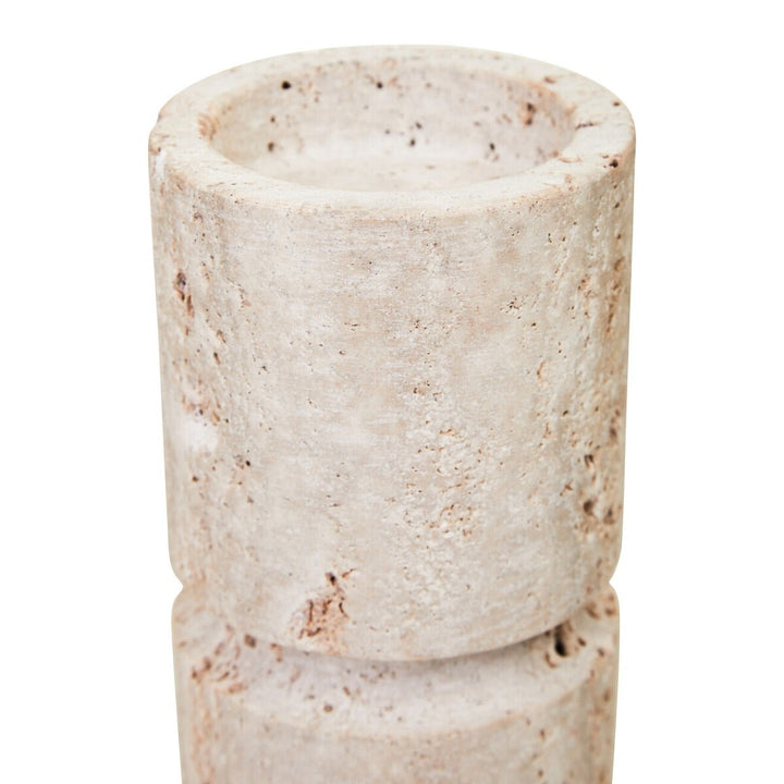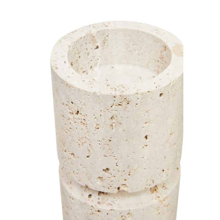 This large candle holder is crafted from travertine, a natural limestone known for its fibrous texture in earthy and neutral tones. Featuring a stacked design, it is built with precison and is ideal for decorating dining tables, mantelpieces, or any corner of home.