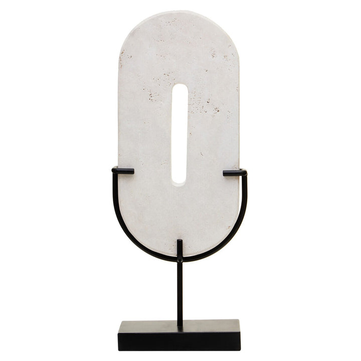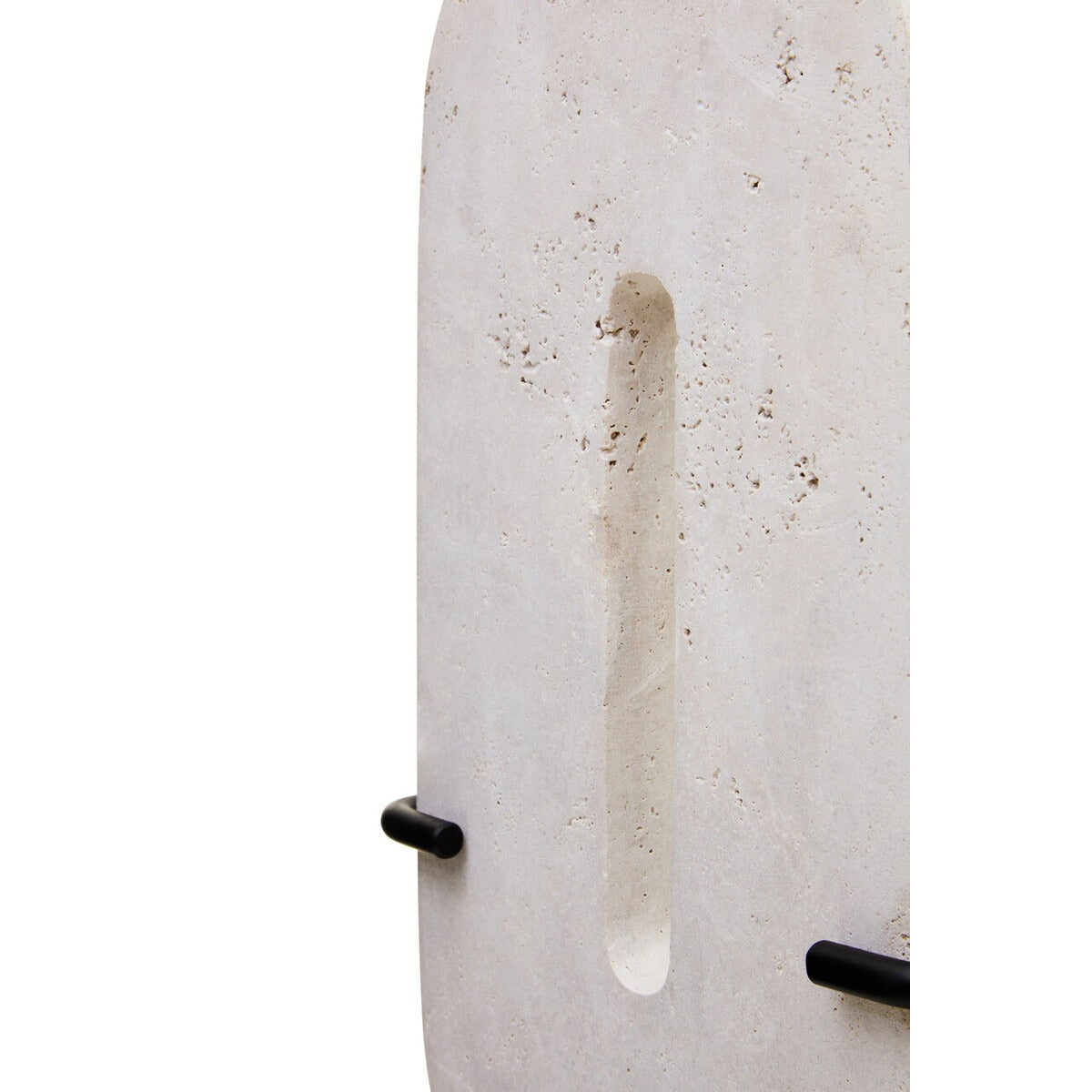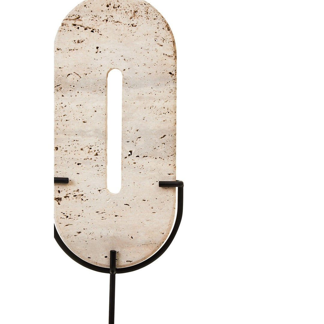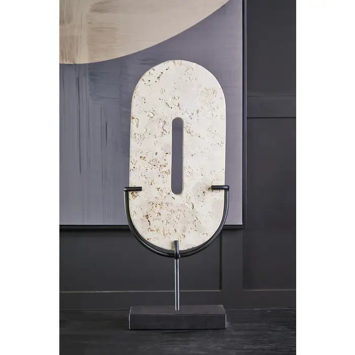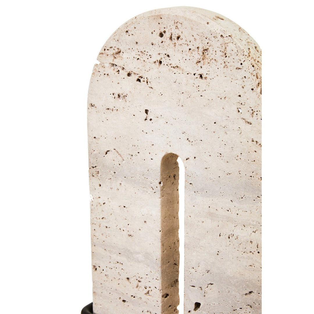 This sculpture is craftd from travertine, a natural limestone known for its fibrous texture in earthy and neutral tones. Encased in a sleek frame, this large cutout sculpture will make a decorative display on a shelf or tabletop.