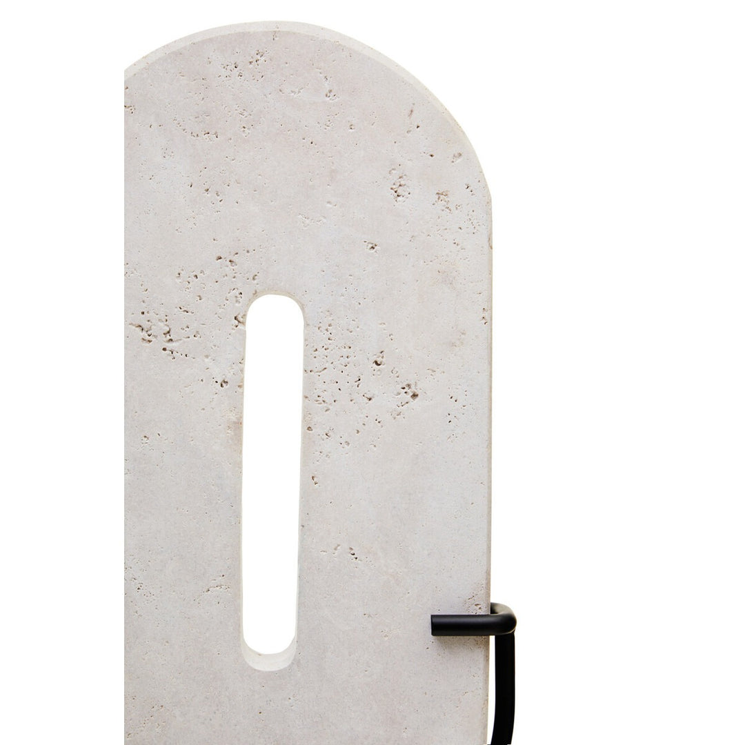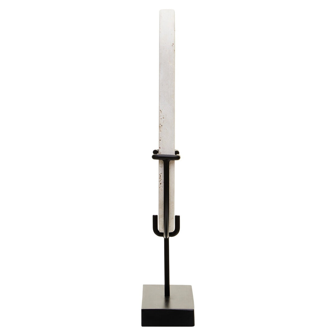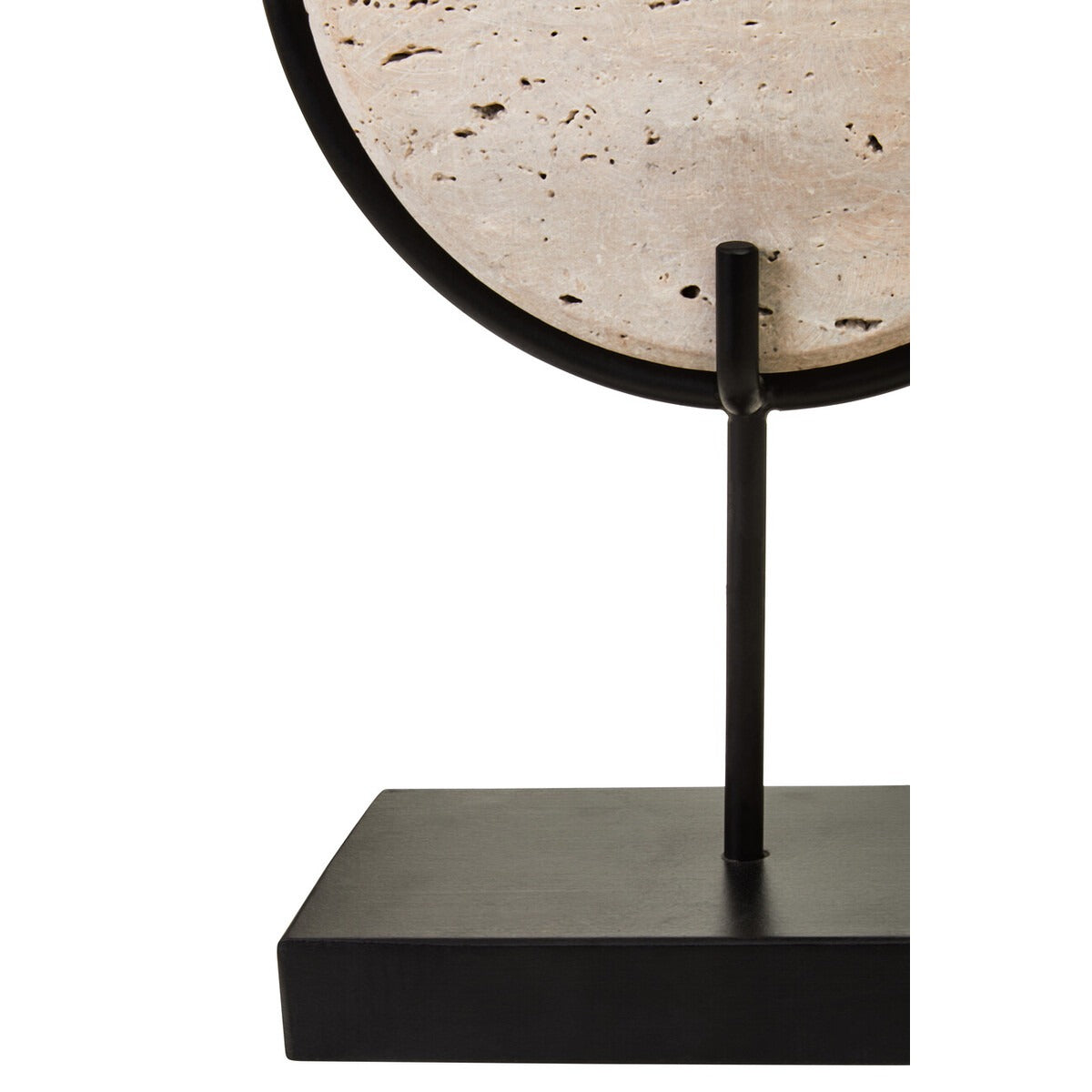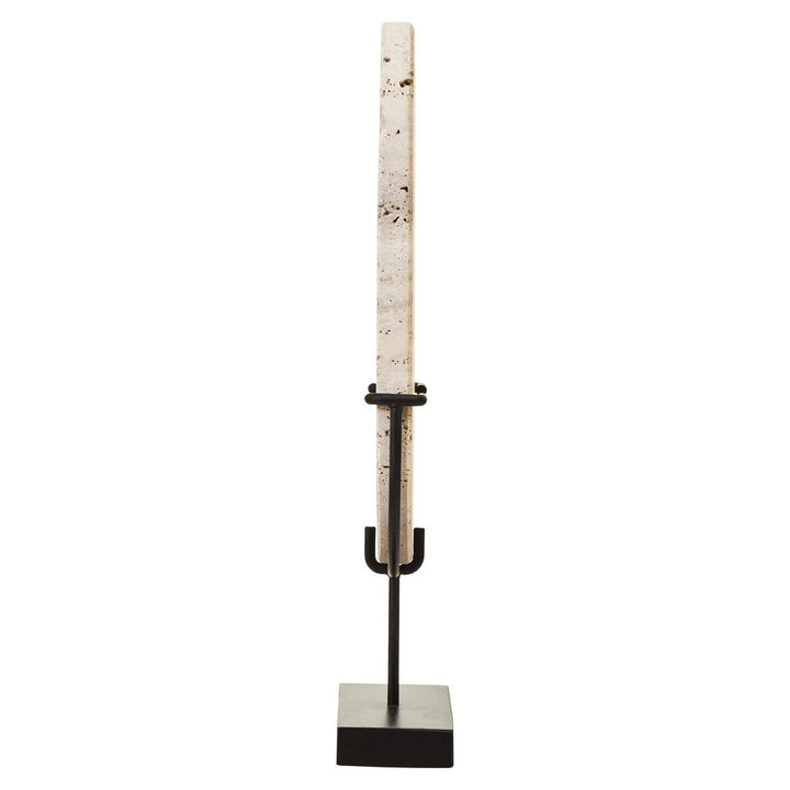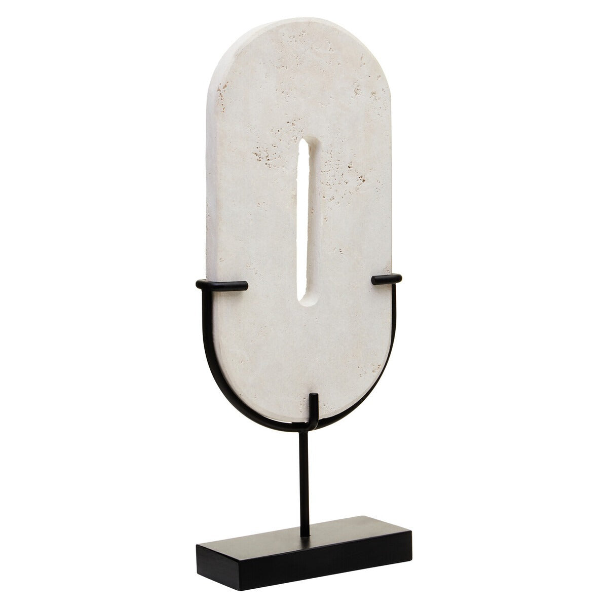This sculpture is craftd from travertine, a natural limestone known for its fibrous texture in earthy and neutral tones. Encased in a sleek frame, this large cutout sculpture will make a decorative display on a shelf or tabletop.
