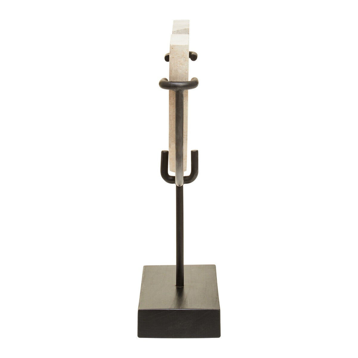This sculpture showcases the natural textures and patterns of travertine, a limestone known for its fibrous texture and earthy tones. Encased in a sleek frame, this small cutout sculpture makes a decorative display on any shelf or tabletop.