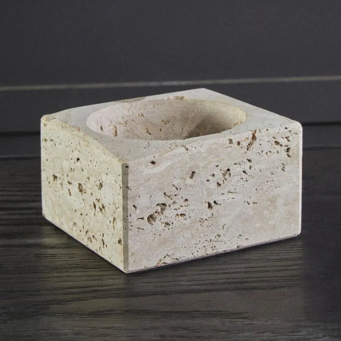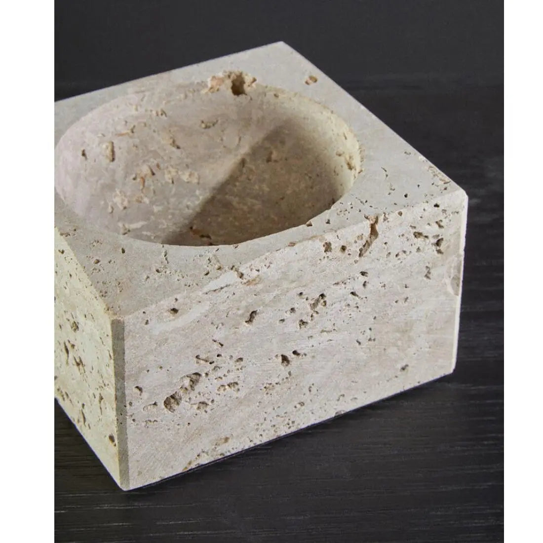 With a square outline and round inner shape, this bowl is crafted from travertine, a natural limestone known for its fibrous texture in earthy and neutral tones. Its intricate detailing and timeless appeal make it an elegant statement piece.
