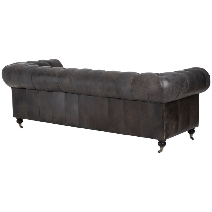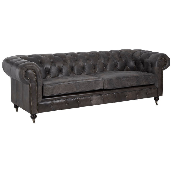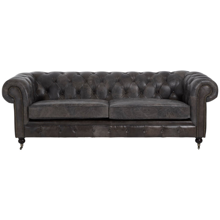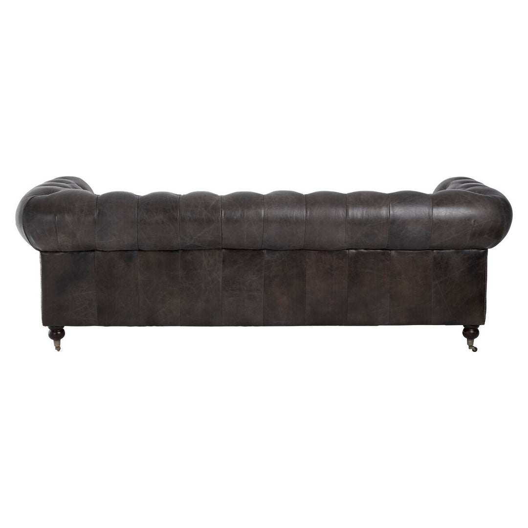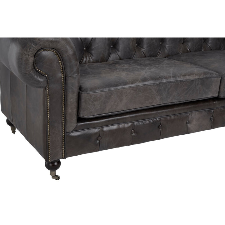 The Victor sofa is upholstered with dark grey leather and features carved walnut wood feet with caster wheels. The rolled armrests are accentuated by metallic stud detail, and its button tufted design gives it a standout heritage look.