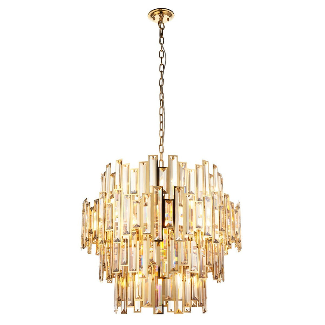 For maximalist drama this magnificent chandelier features cascades of champagne-coloured cut crystal lozenges. This jewel-like centrepiece creates the perfect luxe look. Available in a twelve and fifteen light.