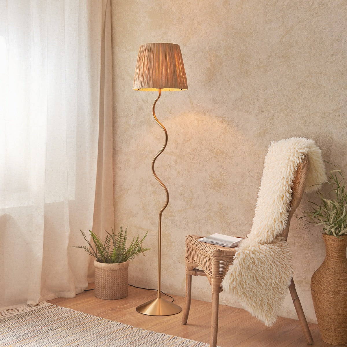 Add a playful style to your interior with this unique wriggle shaped single floor light, complete with wrapped raffia shade and finished in brushed aged brass, with in-line foot switch. Matching wall light, table light and pendant also available.