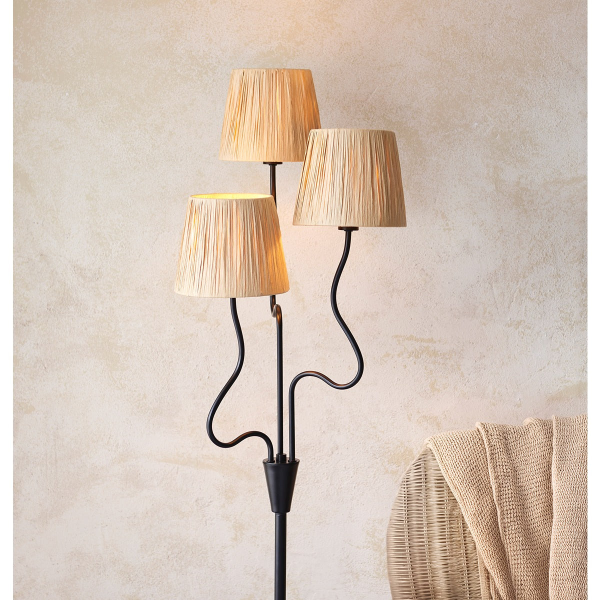 Add a playful style to your interior with this unique wriggle shaped 3 arm floor light, complete with wrapped raffia shades and finished in matt black, with in-line foot switch. Matching wall light, table light and pendant also available.