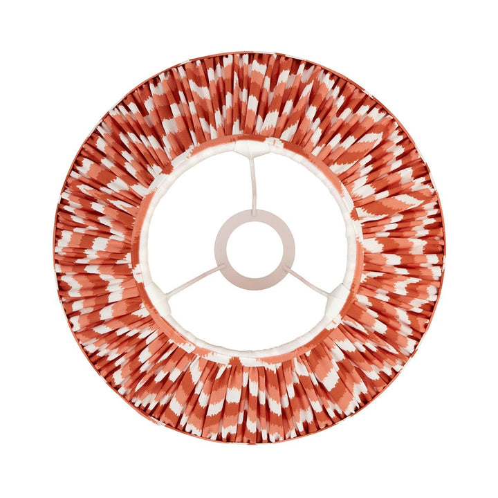30cm tapered shade with white gimbal. Zigzag pattern in an apricot orange colour with taped edge detailing and plain inner lining. Perfect when paired with one of our beautifully decorative table lights.