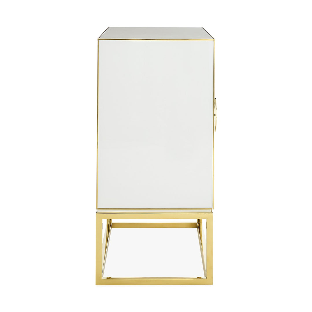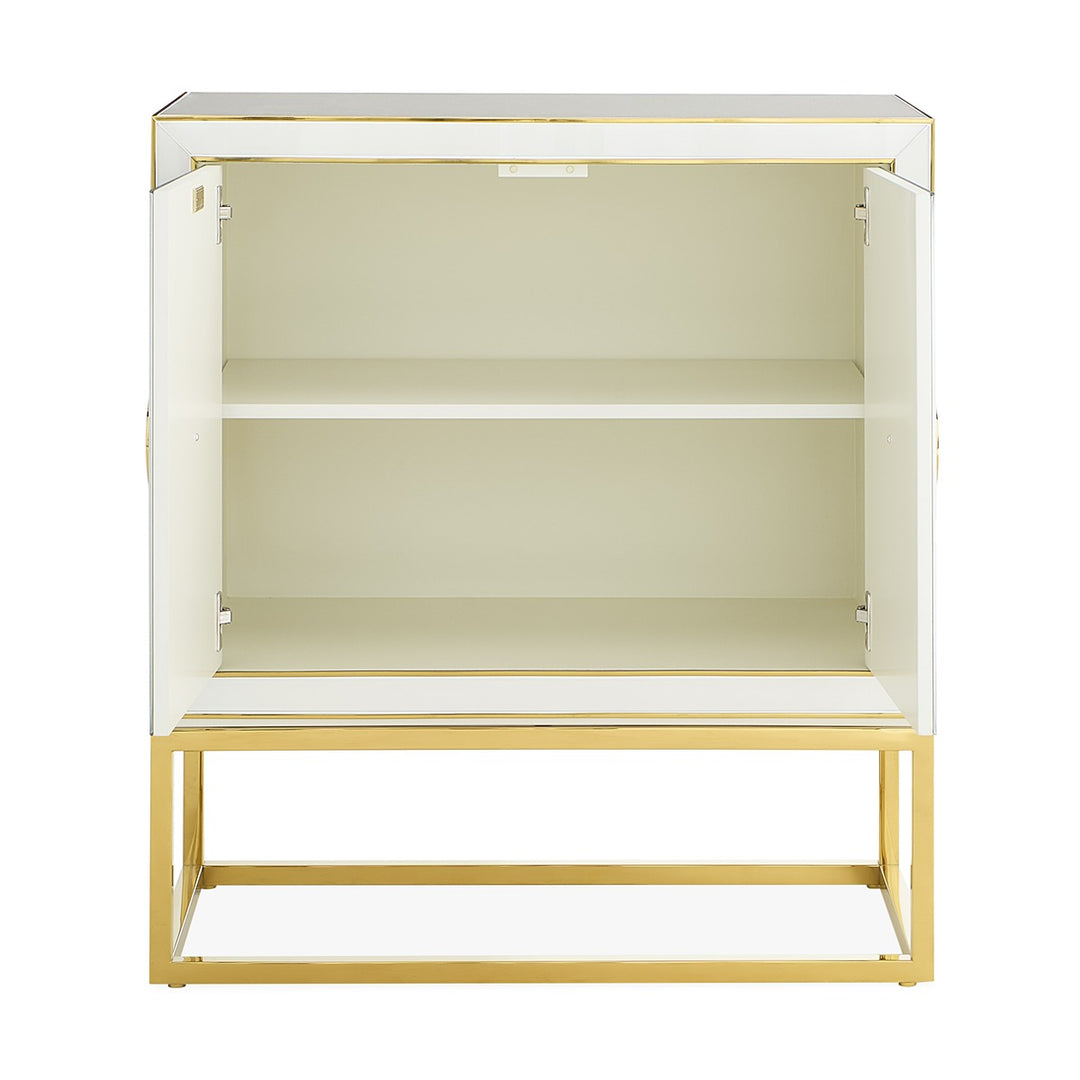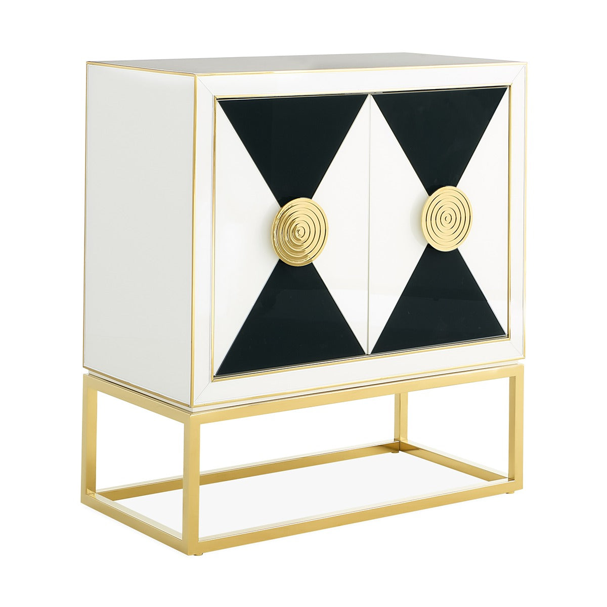 From our mind-bending collection, a modernist cabinet featuring glass panes back painted in charcoal and ivory with polished brass edging. Set on a polished brass base and decked with grooved, split-circle brass door pulls for an extra glam spin. Its ivory interior is fitted with one adjustable shelves. Two (2) doors with one (1) adjustable shelf
