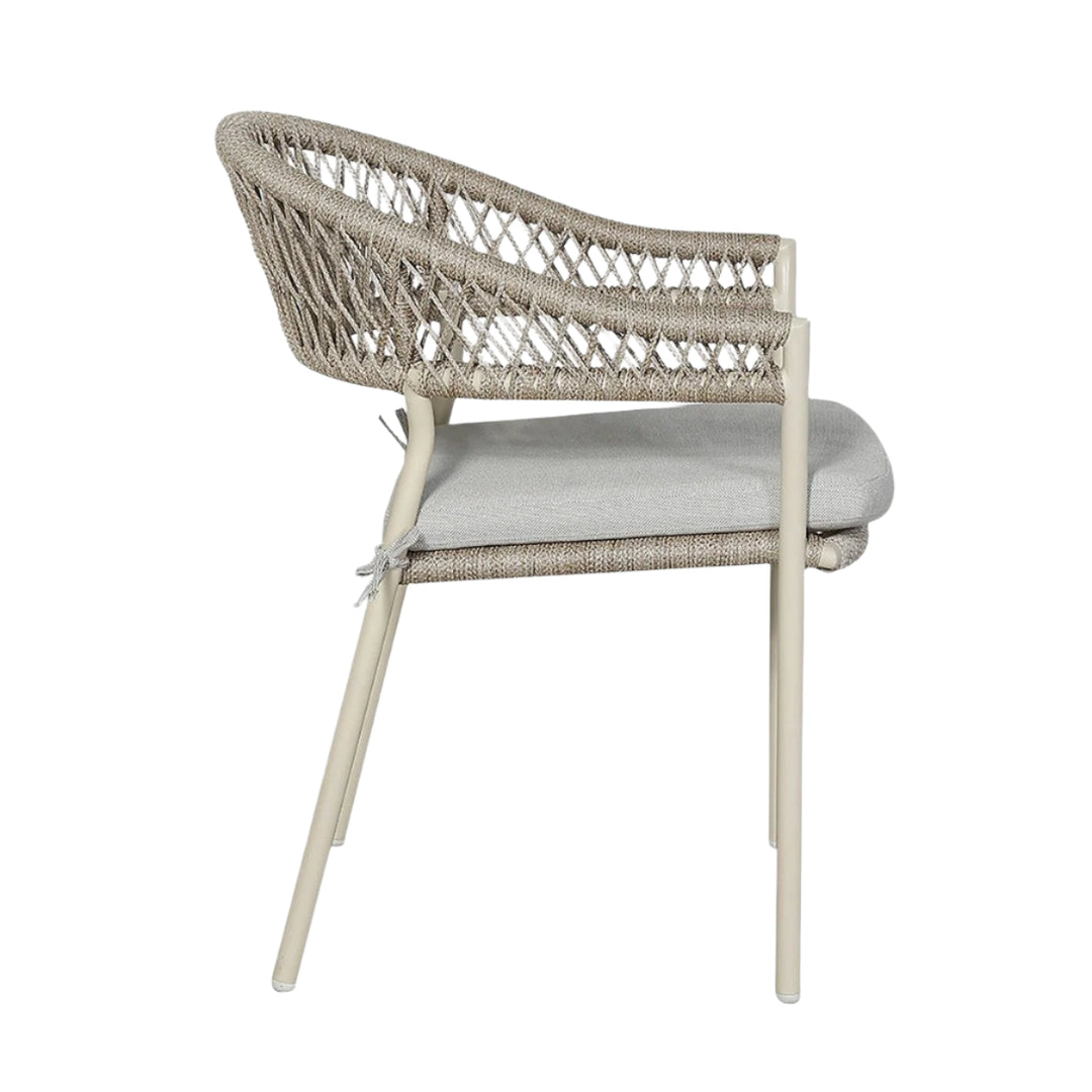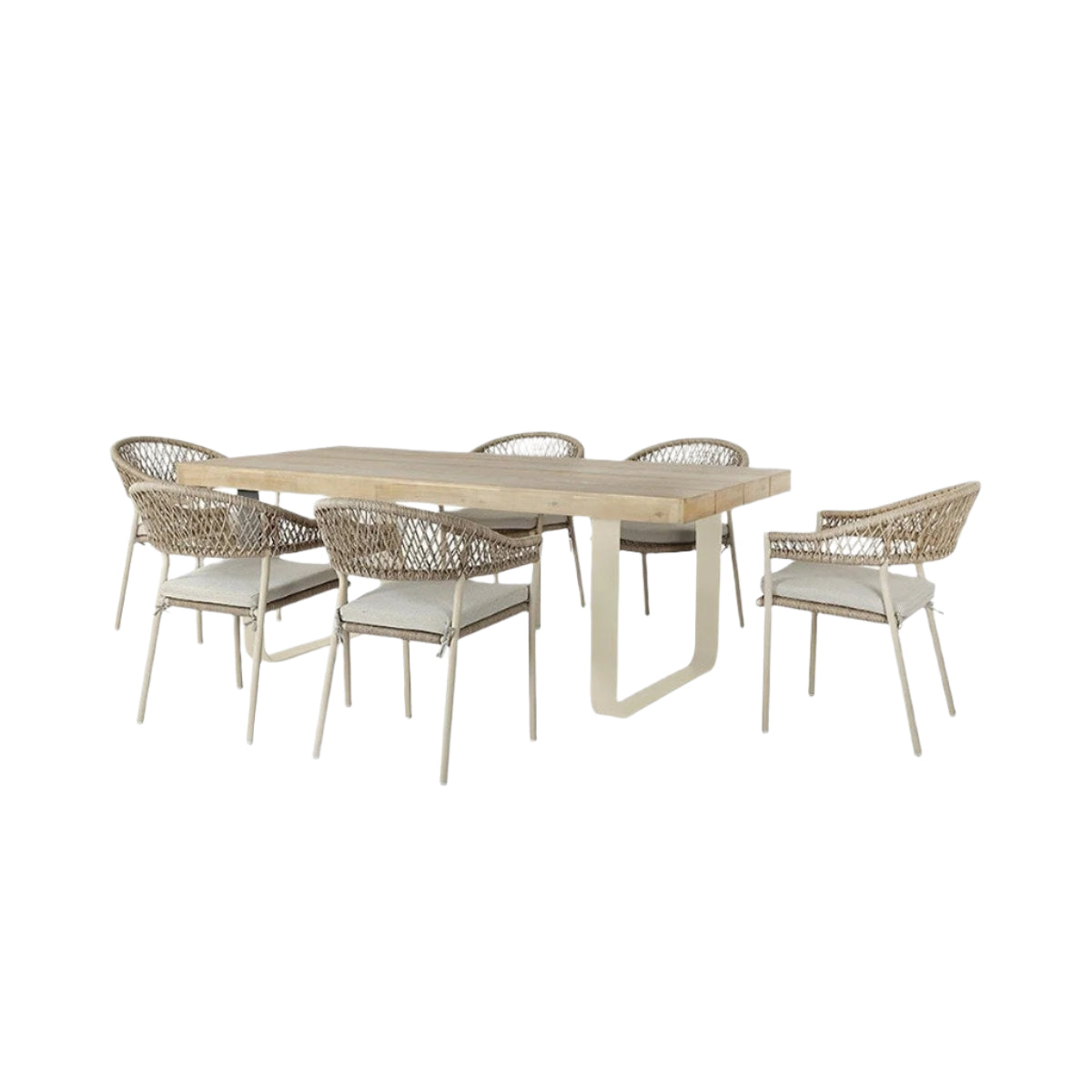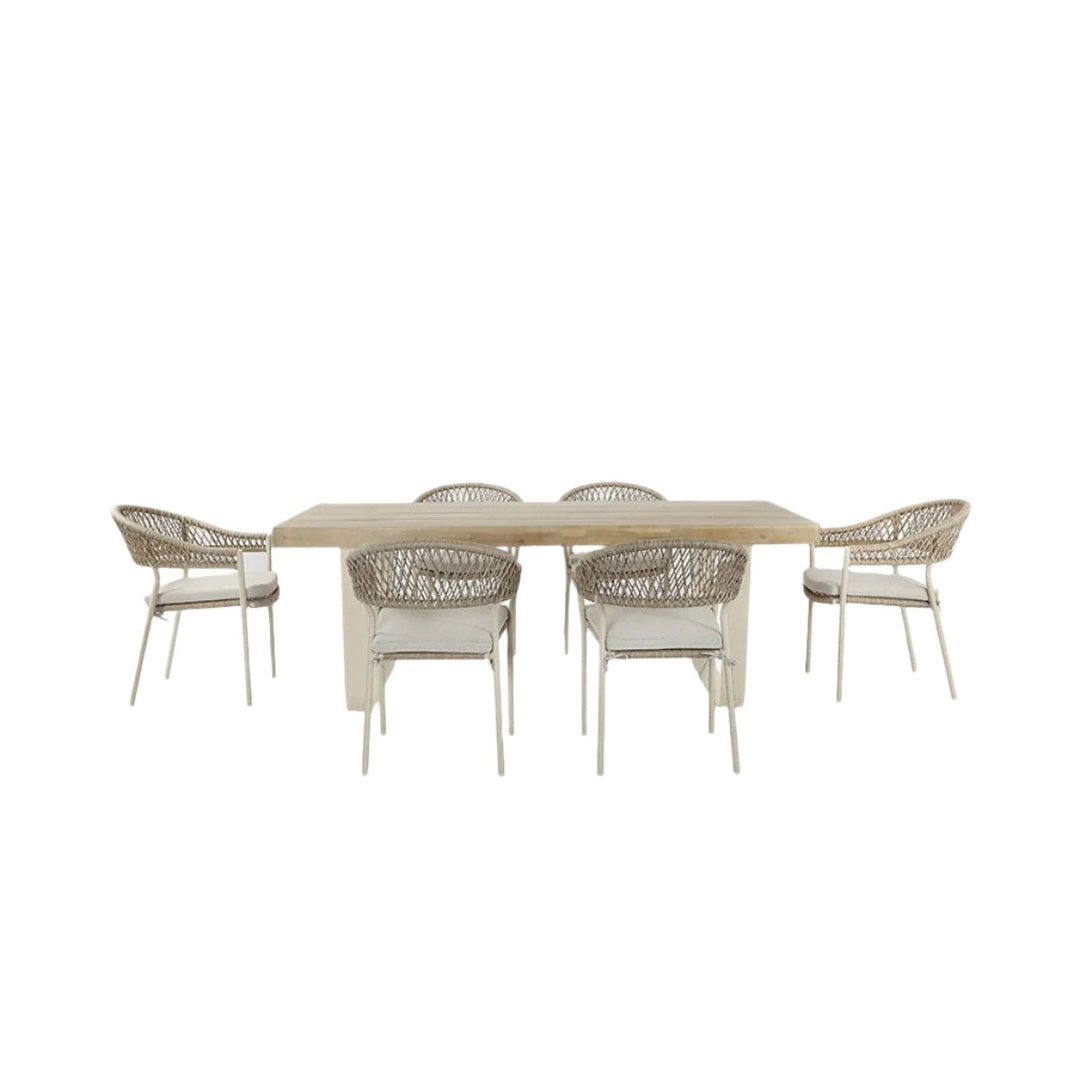 Introducing the Osuna 6 Seater Outdoor Dining Set, made in Vietnam, featuring a contemporary design and a melange of high-quality materials. Environmentally friendly light teak effect acacia wood is used to form the top of the rectangular dining table. The natural materials are complimented by a latte coloured powder coated aluminium frame and natural wheat colour rope weave. This dining set is low maintenance, durable, and resistant to stains and fading meaning it will elevate your outdoor space for years to come.