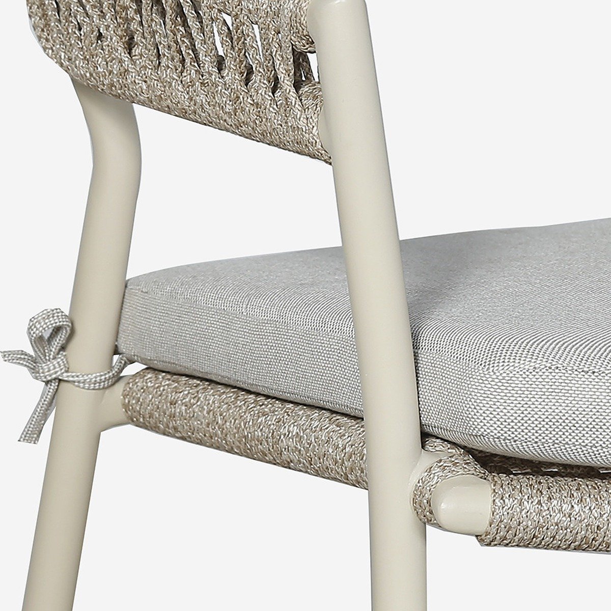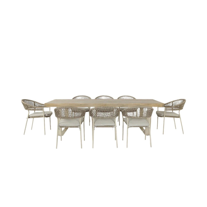 Enhance your outdoor space with the Osuna 8 Seater Outdoor Dining Set. This stylish set features a rounded rectangular dining table and elegant curved back chairs. The contemporary design makes use of high-quality materials including environmentally friendly light teak effect acacia wood, latte coloured powder coated aluminium frame and natural colour rope weave. The natural colour pallette is complimented by light linen natural fabric cushions which are season proof, highly resistant to staining and fading and fire retardant; further ensuring that every detail of this set is of the highest quality.