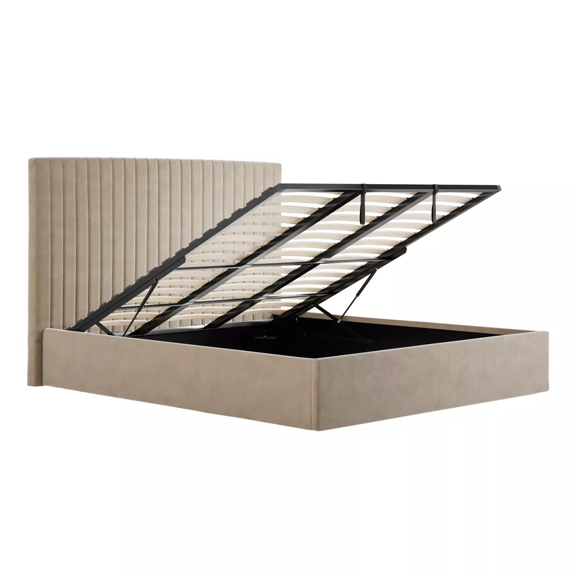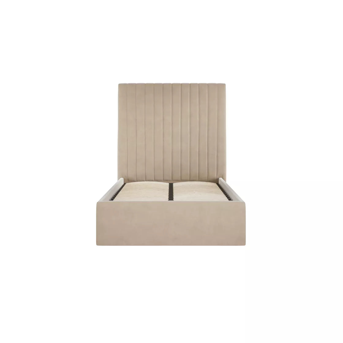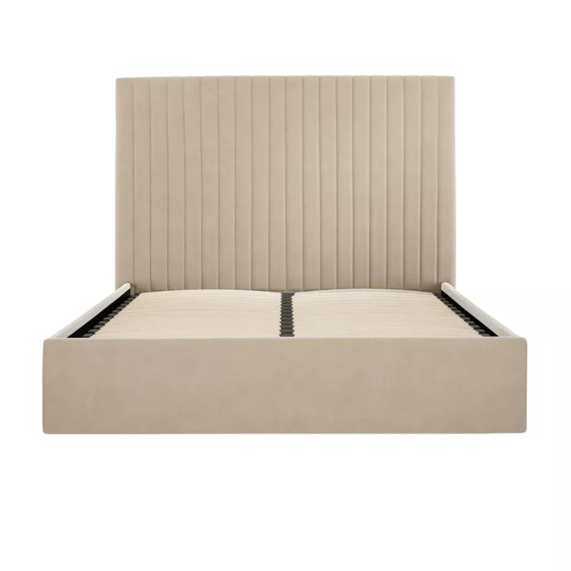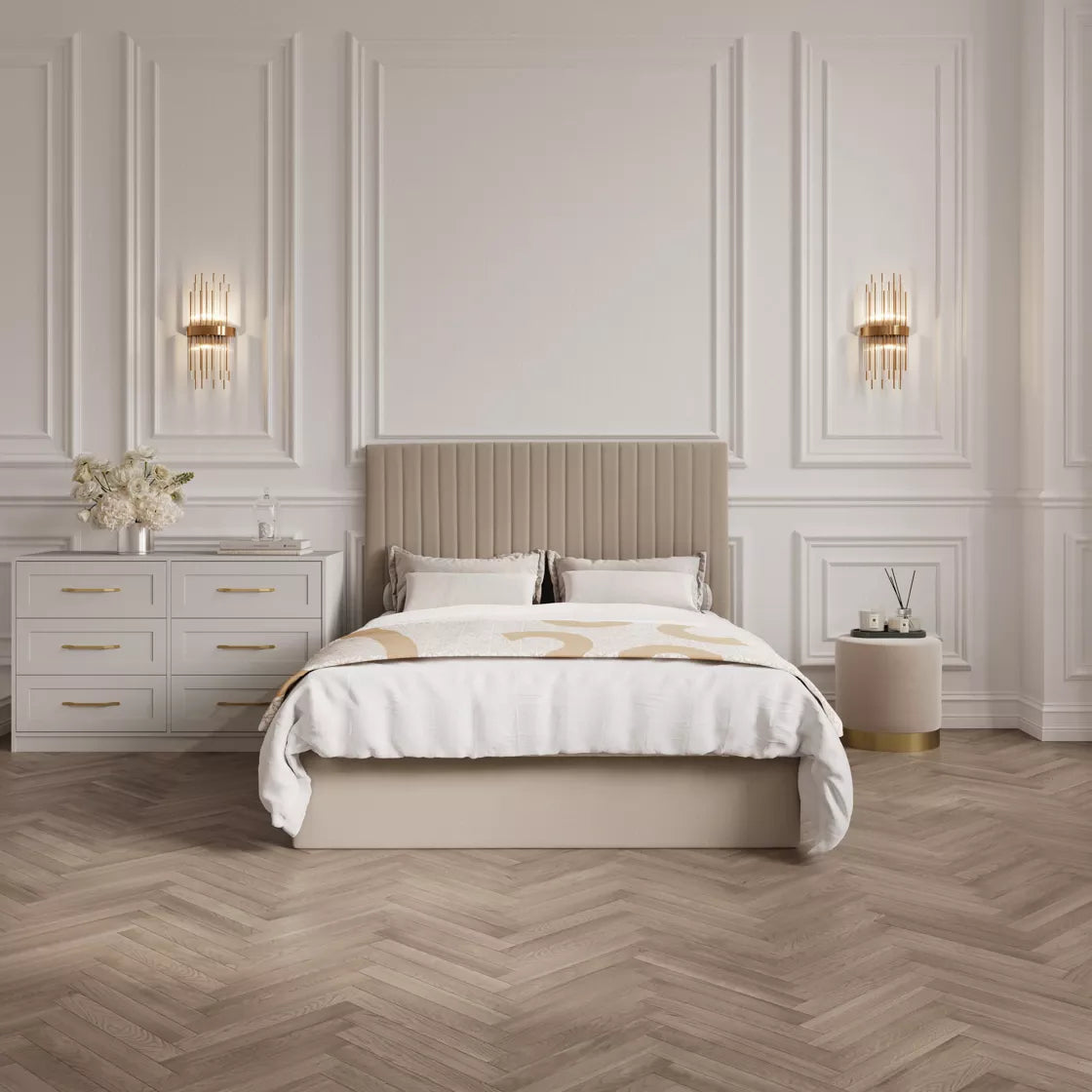 Upholstered in soft beige velvet, this bed offers under-bed storage and a headboard with elegant fluted vertical lines. Available in two headboard heights, its neutral colourway suits any interior.