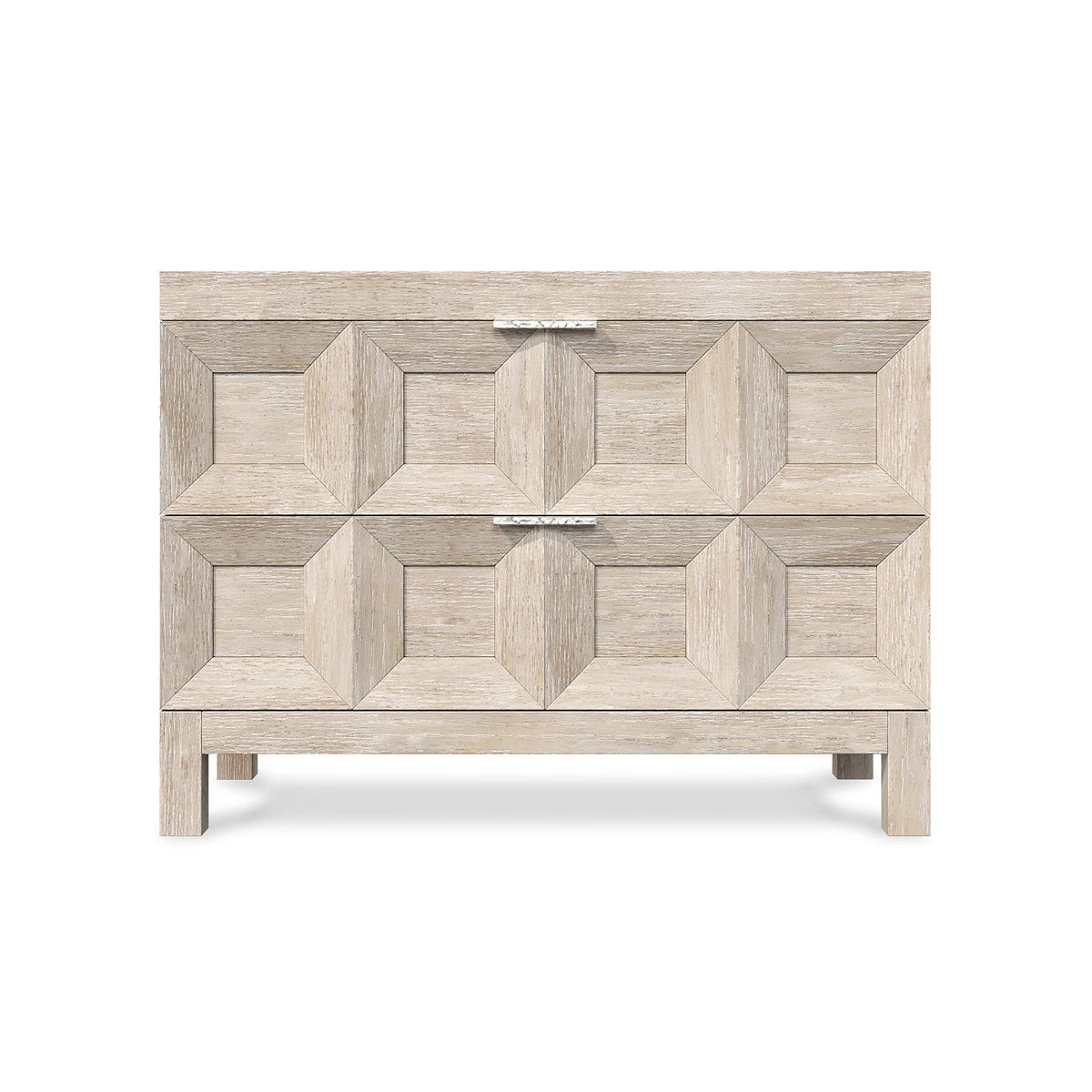 The Prado nightstand finds its inspiration in the coffered ceilings of the Prado museum. Two pull-to-open drawers showcase a dimensional geometric design in cast resin overlays. Subtle grain patterns are highlighted with a Tawny finish. A two-port USB unit offers added functionality on the back of the case.