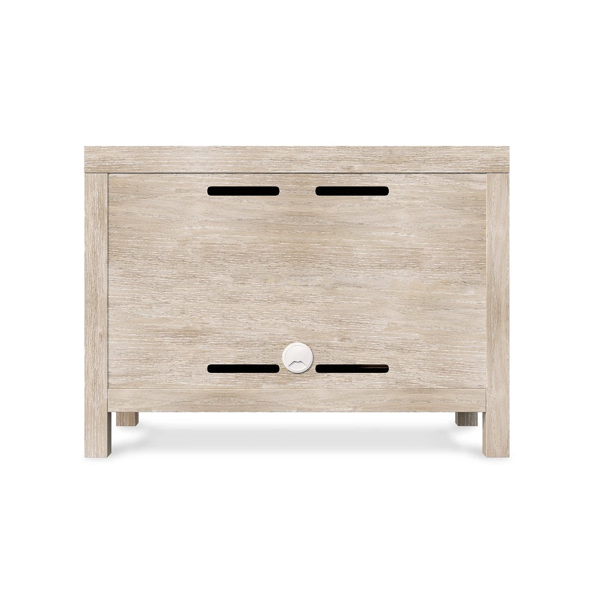 Additional Information: Wire-brushed, white oak veneers in Tawny finish Two soft-close drawers with coffered design cast resin drawer fronts Metal drawer pulls in Bright Graphite finish Two-port USB unit on back of case Adjustable glides & Anti-tip kit