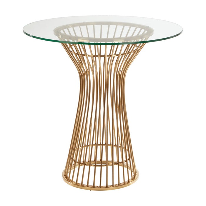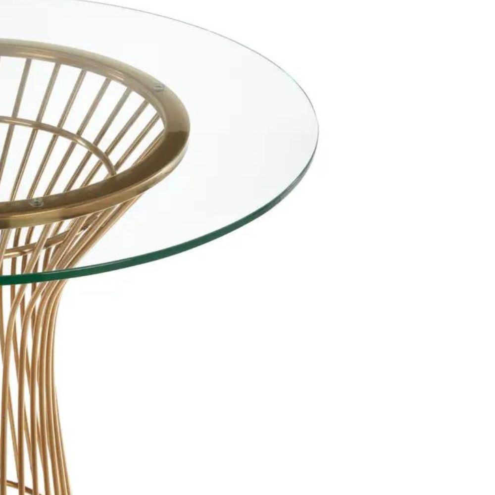 This luxe dining table's base is composed of a series of straight stainless steel bars that have a stacked design. The linear steel has a mirrored finish that complements the overhanging rectangular glass top. The tempered glass is clear to allow one an unobstructed view of the stacked steel below. Its single leg is formed from slim strands of smooth metal. Each one is coloured warm gold, and follows a tubular formation that flares out to support the tabletop. The circular tabletop is made from a single piece of tempered glass, with a clear finish that contributes to the table's airy and contemporary feel.