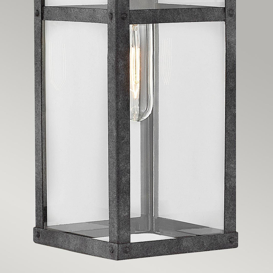 Illuminate your outdoor space with the Quintiesse Porter 1 Light Medium Wall Lantern in Aged Zinc. This chic wall lantern combines Modern Farmhouse and Industrial styles, featuring fine rivet details and an Aged Zinc finish for a timeless appeal. The sturdy hanger loop adds a touch of charm, while the clear glass panel provides warm and inviting illumination. Whether installed individually or in a series, the Porter Wall Lantern enhances the ambiance of your garden or outdoor area. Trust in Elstead's dedication to quality and craftsmanship to bring style and functionality to your outdoor lighting with the Porter Medium Wall Lantern.