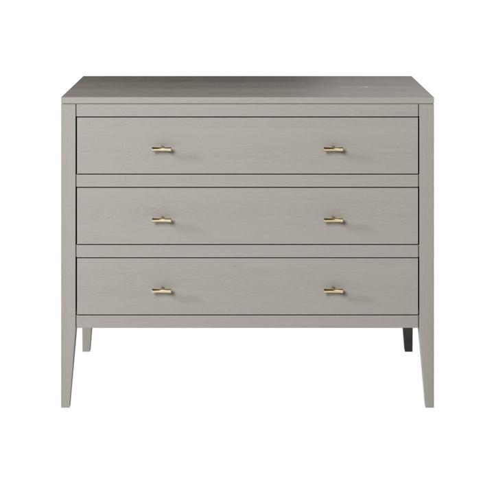 Beautifully crafted from solid oak and oak veneer, this three-drawer chest combines timeless design with everyday functionality. The soft grey finish highlights the natural grain for added character, while gently tapered legs lend an elegant silhouette. Smooth metal runners ensure easy drawer access, and brushed brass-style bar handles complete the look with a refined touch.