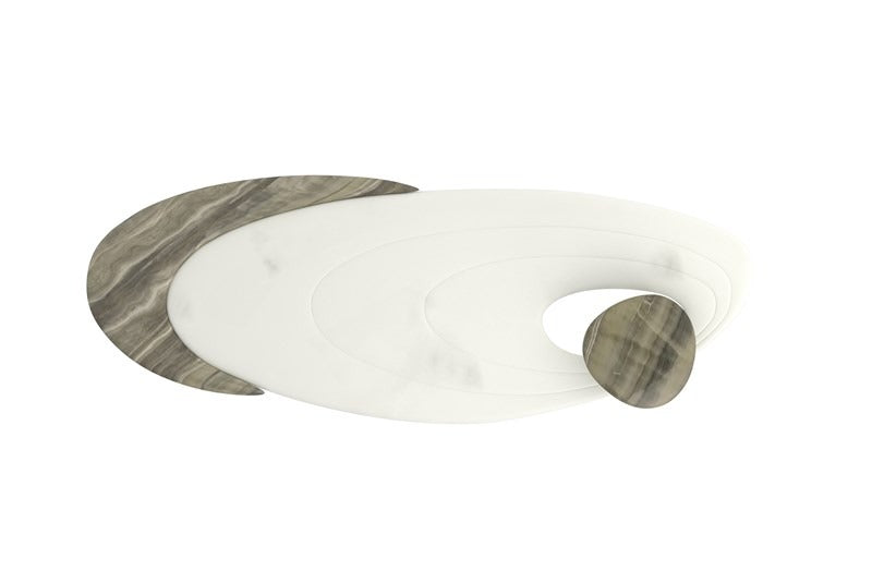 The Resonance Cocktail Table is inspired by the “Butterfly Effect” in which a small event creates far-reaching effects. This contemporary statement piece features a White marble top, with accent swirls that ripple out from a smaller, offset, elevated Grey Onyx oval marble top to a raised half-moon-shaped Grey Onyx section. Each piece is supported by a metal frame and tapered legs in shimmering Champagne Gold. For the modern collector, this piece is out of this world. FEATURES: Metal frame in Champagne Gold. Top stone sections in Grey Onyx and Guangxi marble. Caracole Classic was born of our vision to create a furnishings line that had personality, was playful, and an exciting value for high-style furniture. We are known for our use of unique materials, finishes and fabrics. Our emphasis is on design individuality while also addressing whole room environments through an eclectic lifestyle approach. We strive to create a unique genre in furniture design: distinctive pieces for every room of the home that are sophisticated, refined, and creative.