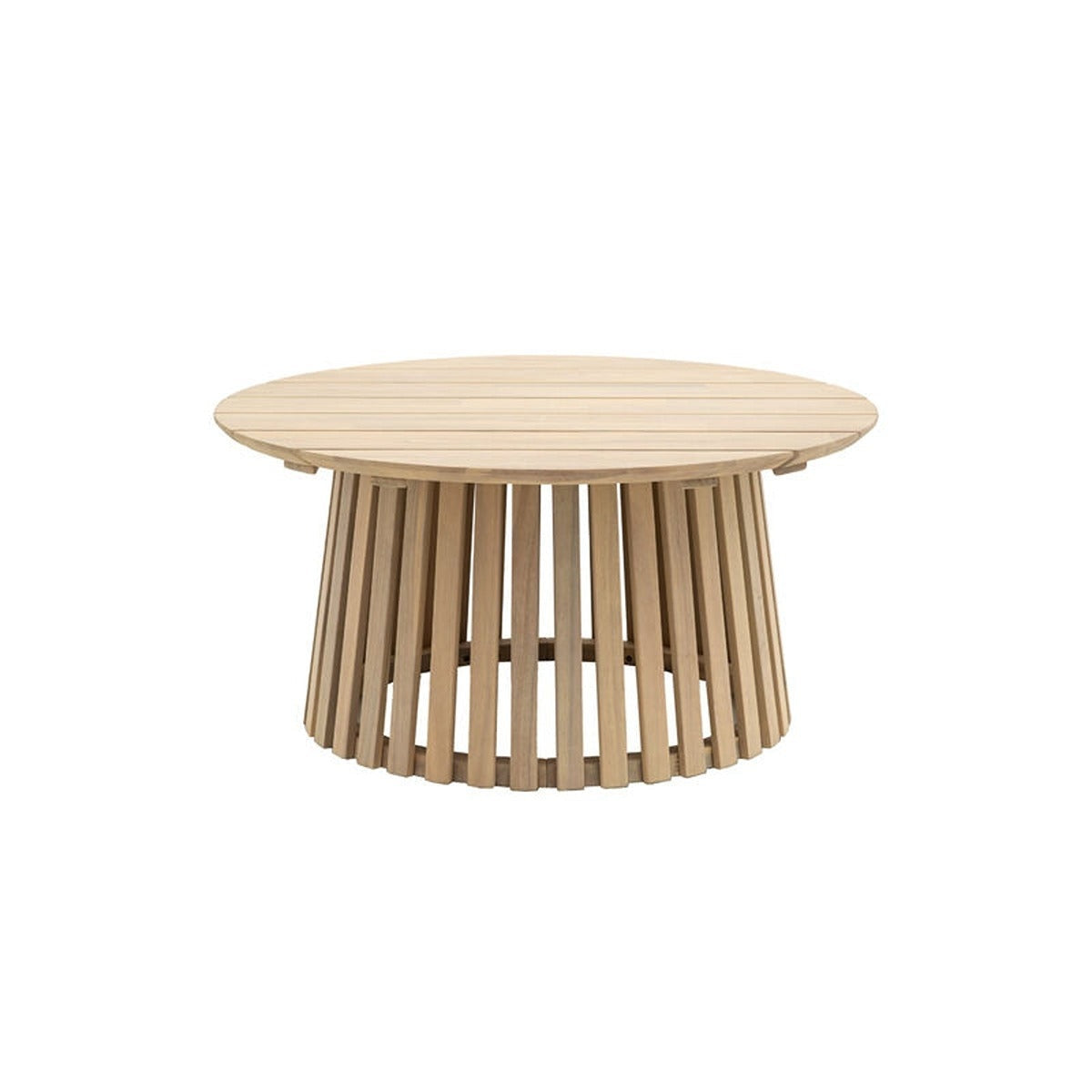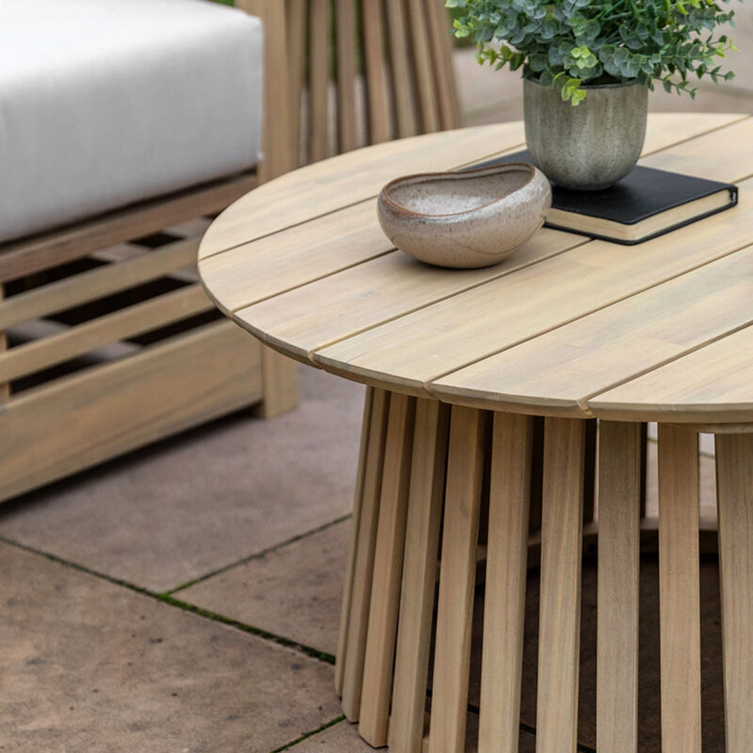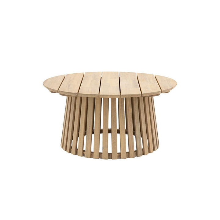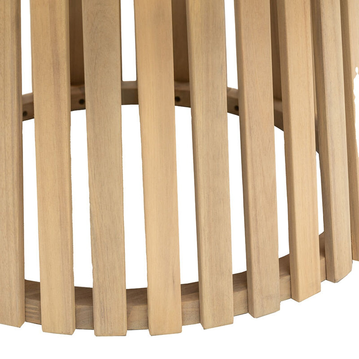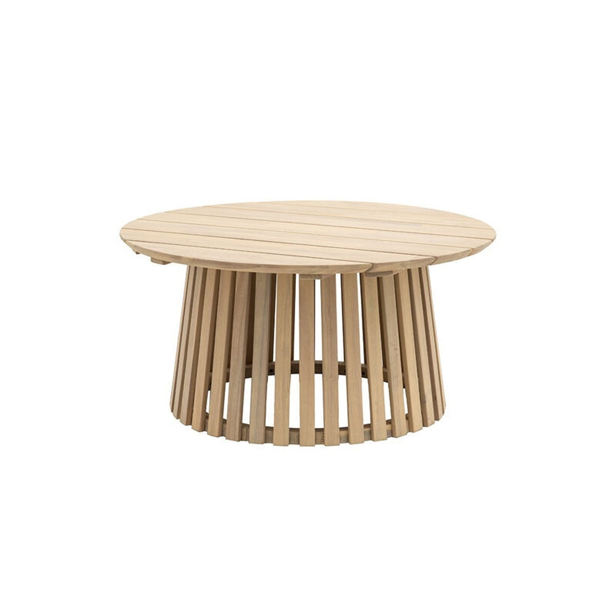 This elegant outdoor coffee table features a circular top and a unique, slatted base. Crafted from durable acacia wood, it brings a touch of sophistication and warmth to any patio or garden setting. This table is both stylish and functional, perfect for serving drinks, displaying decor, or simply adding a touch of elegance to your outdoor space.