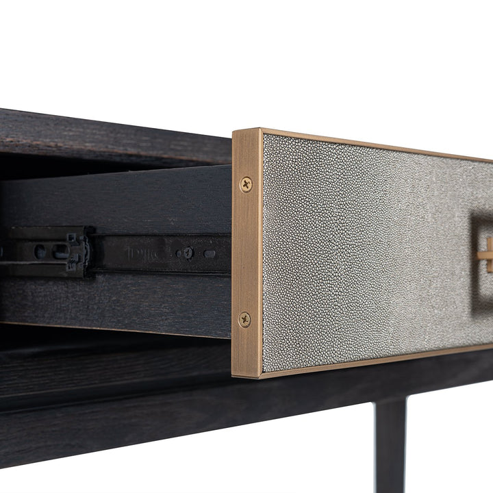 Add timeless style and a classic design to your room in the form of the gorgeous and chic Richmond Bloomville 3 Drawers Gold Console Table. The elegant style of this console table, with its old oak base, PU leather top, and gold handles on its 3 drawers, will add a sophisticated atmosphere to your space.