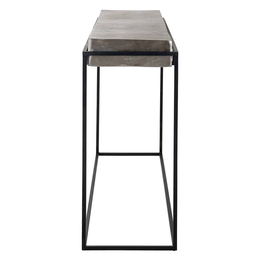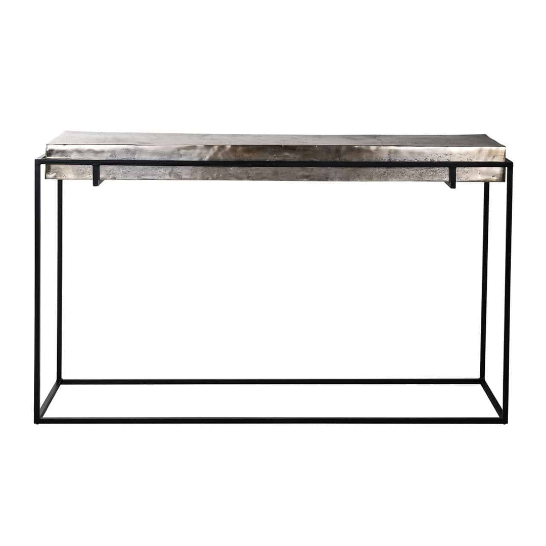 This Richmond Calloway champagne gold console table is both striking and eye-catching. Inspired by industrial minimalism, the console table is a versatile piece that will adapt to a variety of settings in the home.