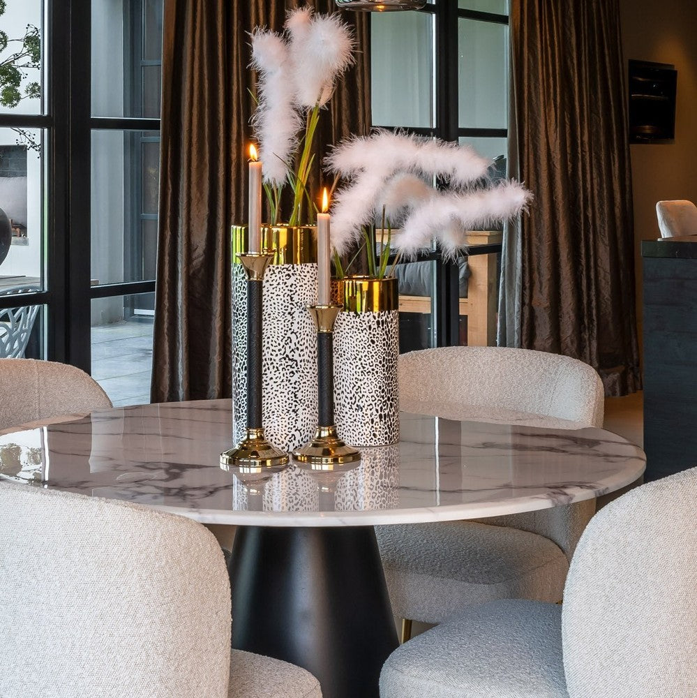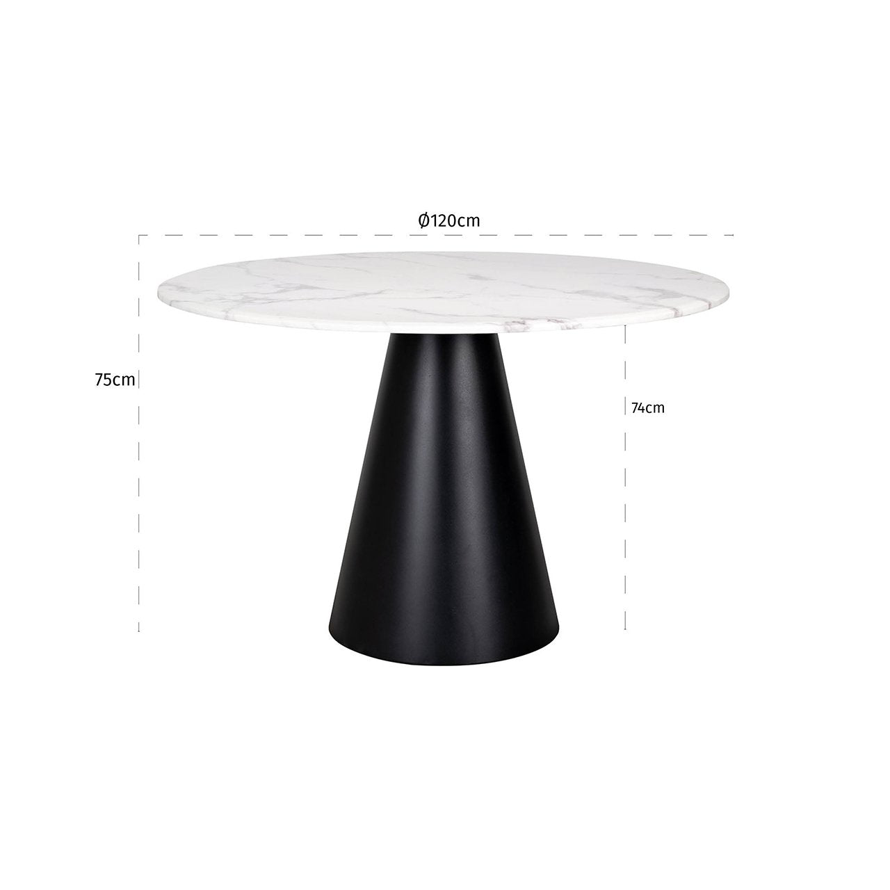Add a touch of style to your home with the Richmond Degas White and Black Dining Table. This unique dining table is the perfect addition to complement your modern dining room or kitchen. This elegant and contemporary dining table has a black cone-shaped base and a beautiful white faux marble table top.