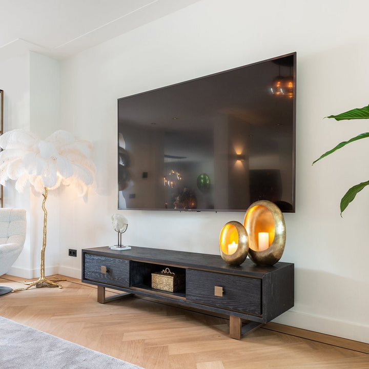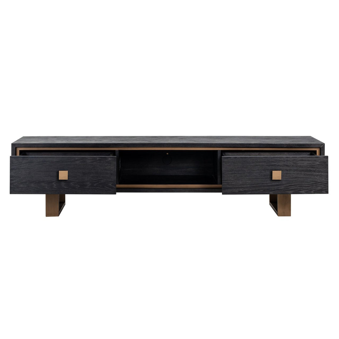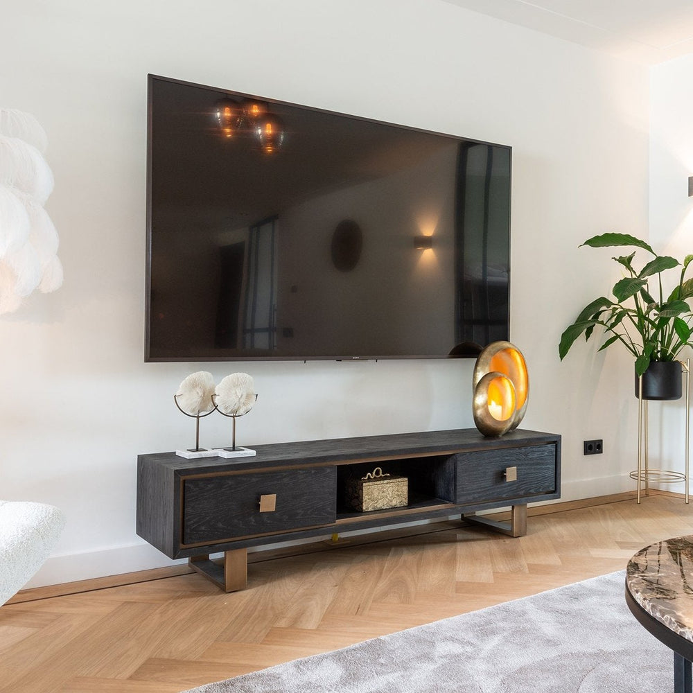 The black oak Richmond Hunter TV unit, which has matt gold details and two black drawers for storage, stands at 46cm in height, 190cm wide, and 40cm from the wall. This versatile piece will particularly suit classic and simple décor in your home.